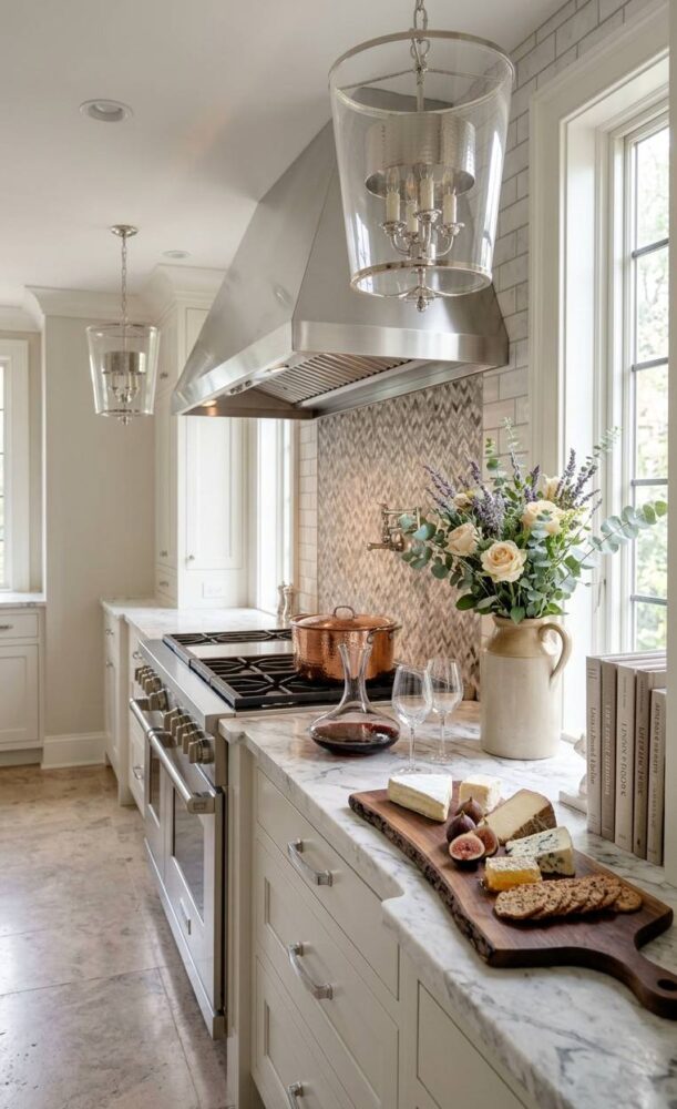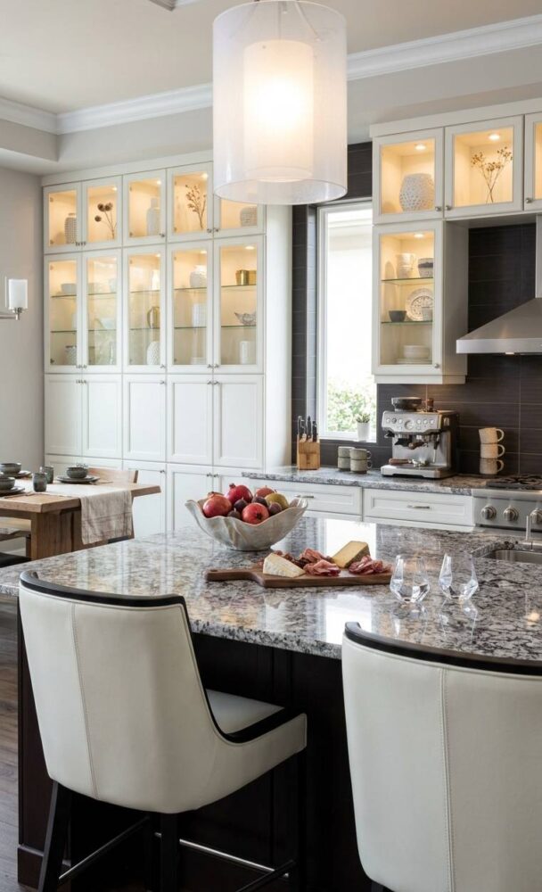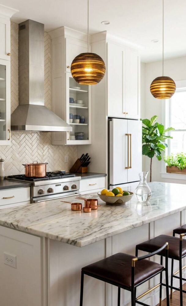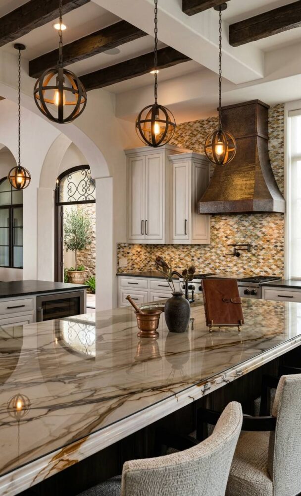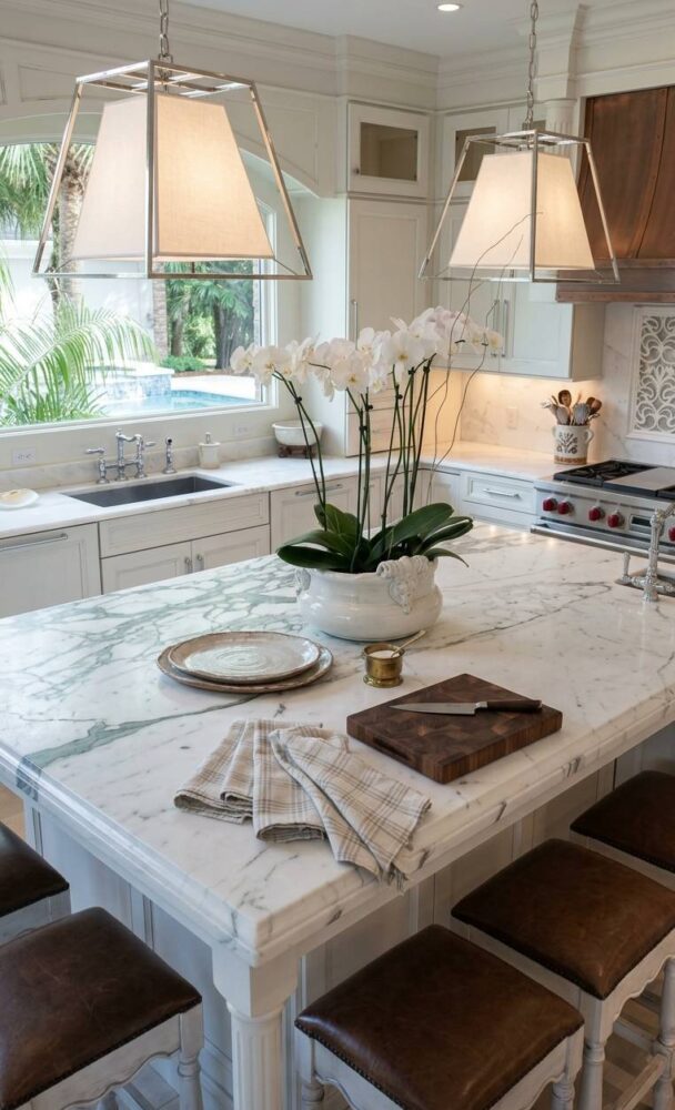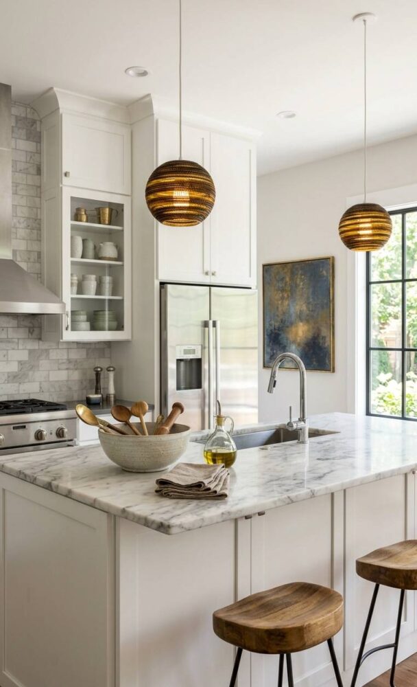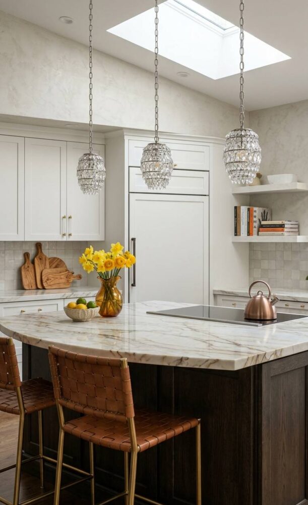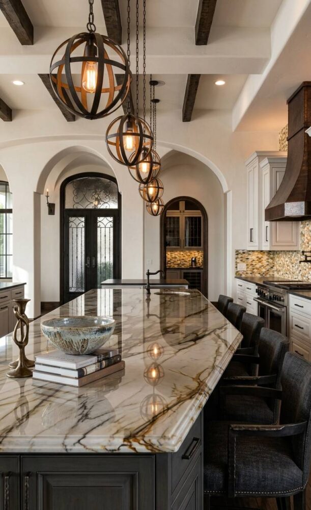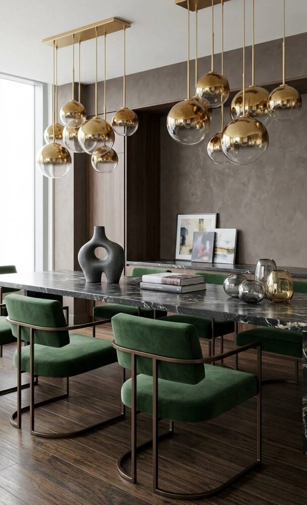 Always hang your decorative fixtures high enough to maintain clear, unobstructed sightlines. However, ensure they remain low enough to be intimately engaged with the space. Utilize warm-toned bulbs to enhance the luxurious finishes of your chosen design.