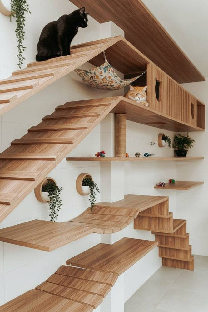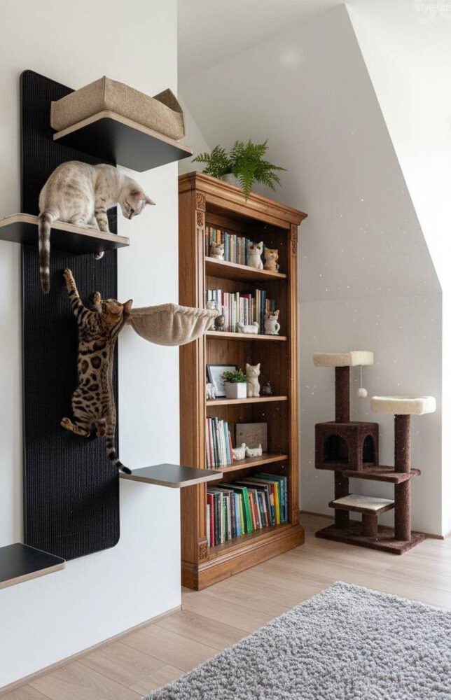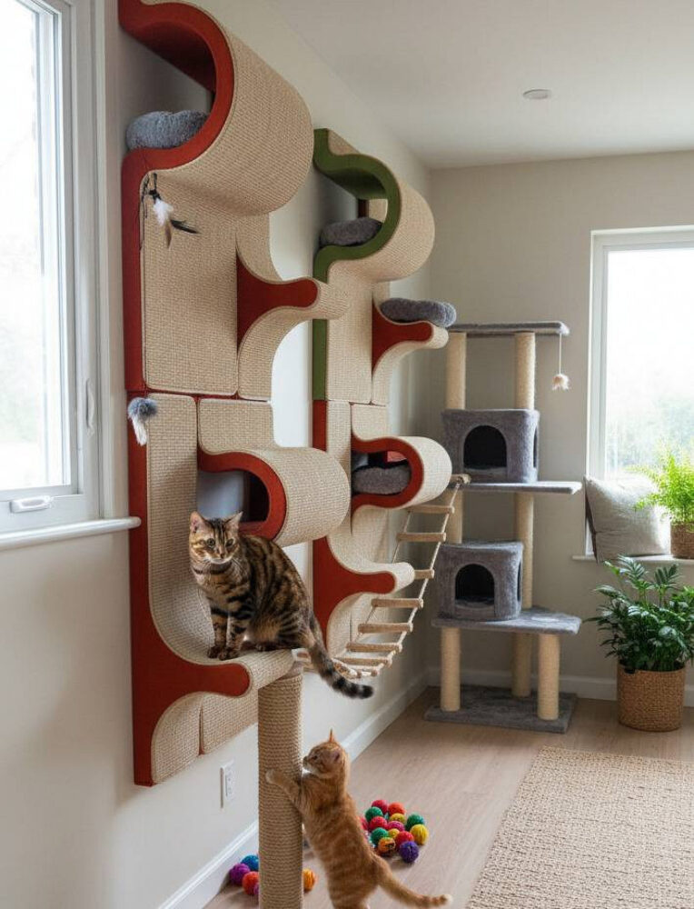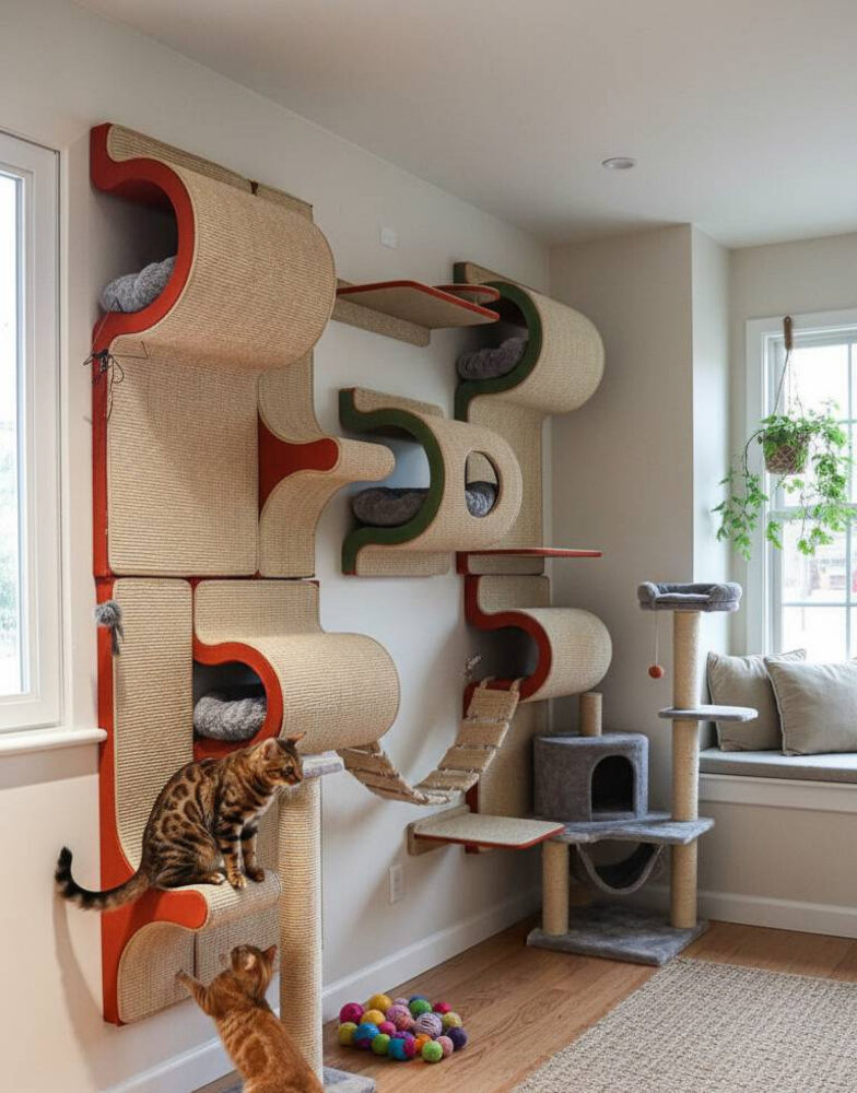 When designing for more than one feline, resource guarding can become a serious issue. Peaceful multi-cat households require multiple pathways and plenty of separate resting zones. Make sure no cat can be easily cornered by a bossy sibling on a shelf.