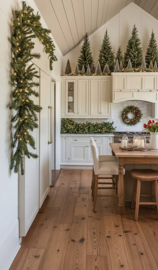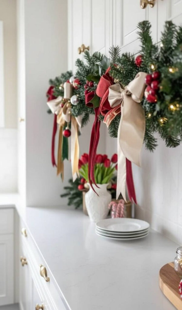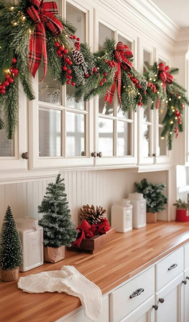 Draping greenery is a wonderful way to soften hard edges. A Christmas garland for cabinets adds natural beauty. You can drape it across the very top of your cabinetry.