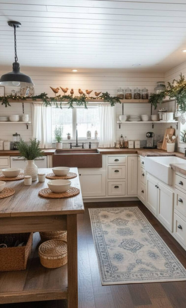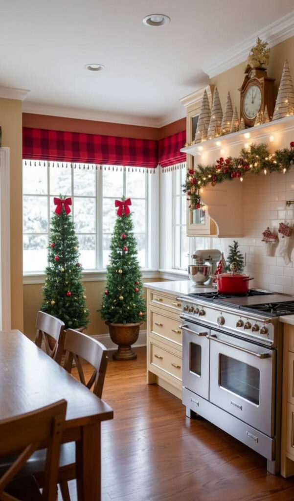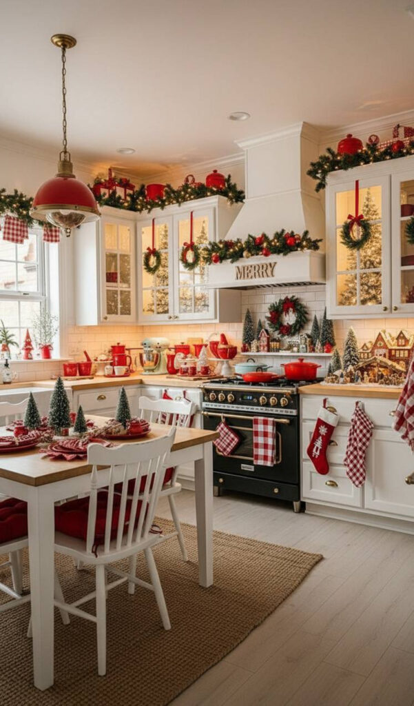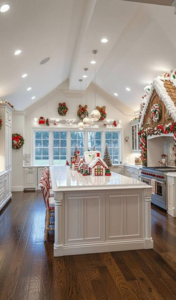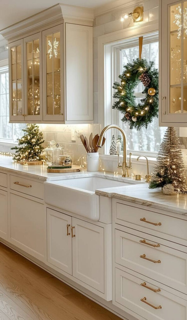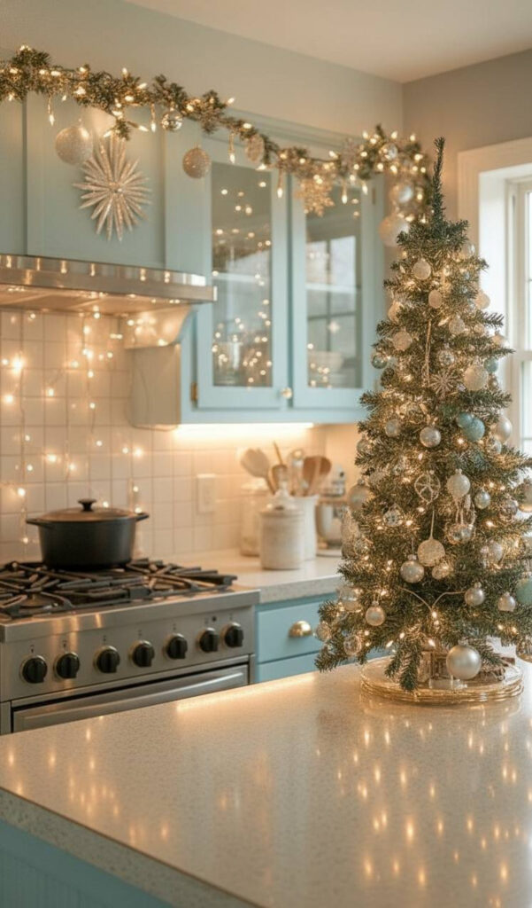 This style mimics a winter wonderland. It feels clean, bright, and sophisticated. It is perfect for a modern christmas kitchen.