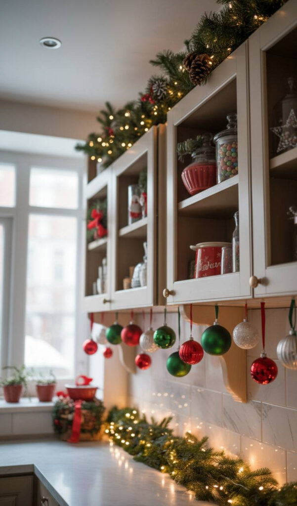Choose shatterproof ornaments for safety in the kitchen. You can use matching colors for a unified look. Or, mix different shapes for an eclectic vibe.
