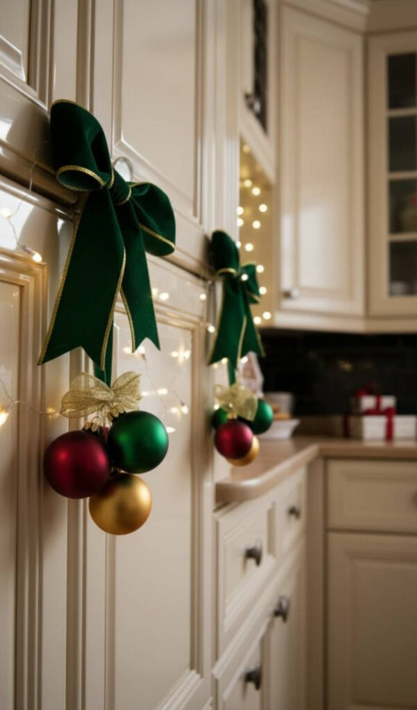 Finish with a large stick-on bow. This has a huge visual impact. It is one of the most creative Christmas cabinet decor ideas.