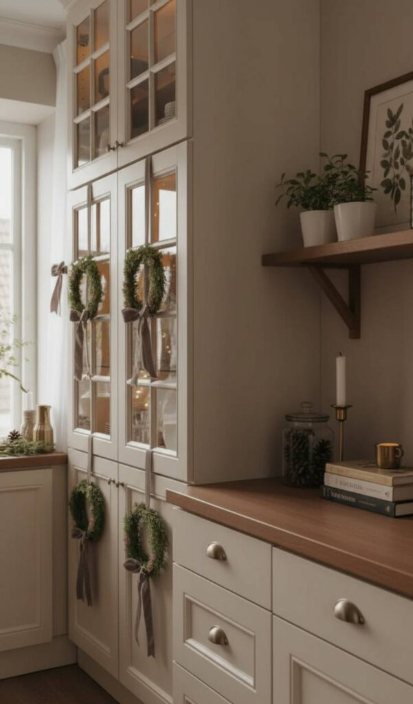 Hang them using a long loop of ribbon. Center the wreath on the upper cabinet door. This creates a symmetrical and balanced visual effect.