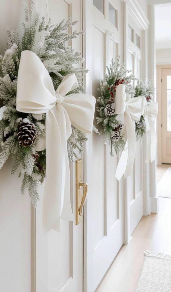Metallics add shine and elegance. Use gold or silver wreaths instead of green ones. Use metallic ribbon for your bows.