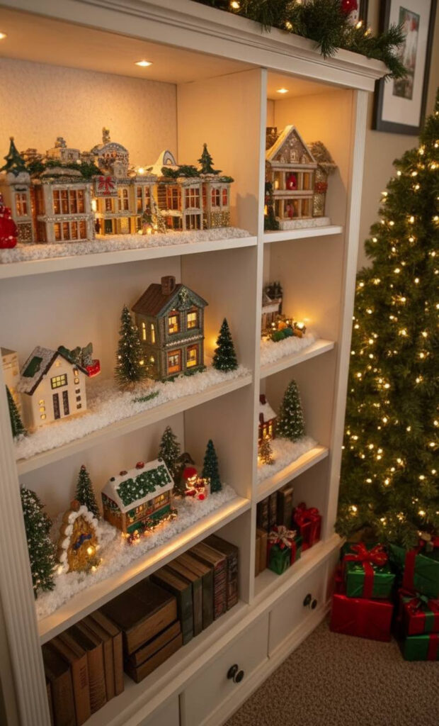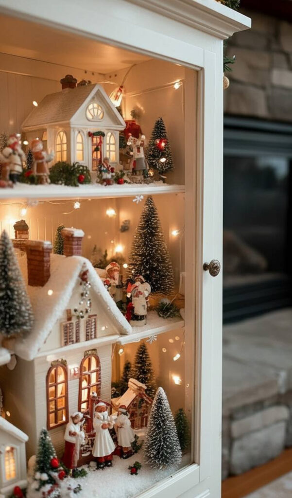 You can even add small ornaments inside the cabinet. Place them in glass jars or bowls. This adds sparkle behind the glass.