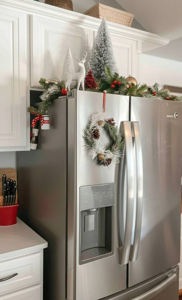 This method is very budget-friendly and effective. It adds color without adding bulk to the door. It is a classic staple of Christmas cabinet decor ideas.