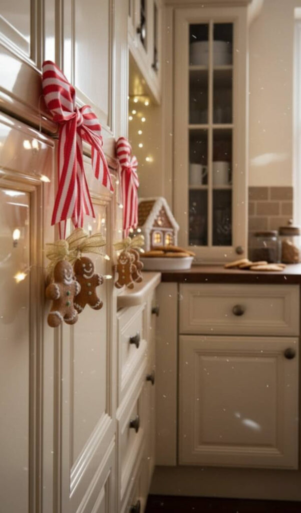 Hang gingerbread man ornaments from the knobs. You can also display real or faux gingerbread houses. Place them on the counter or open shelves.