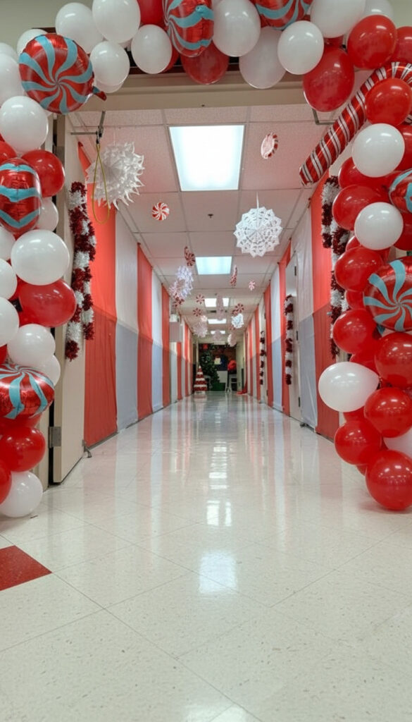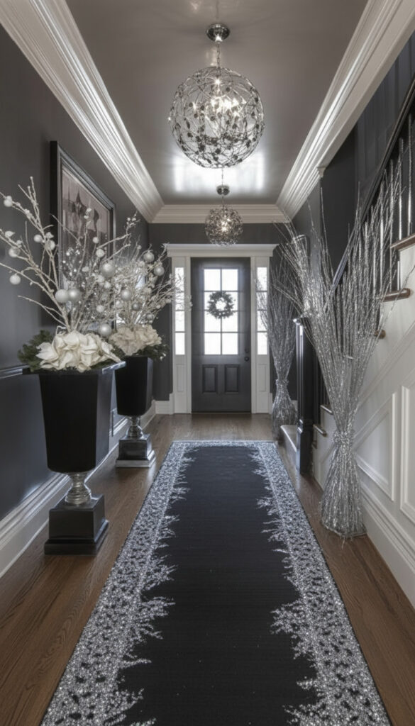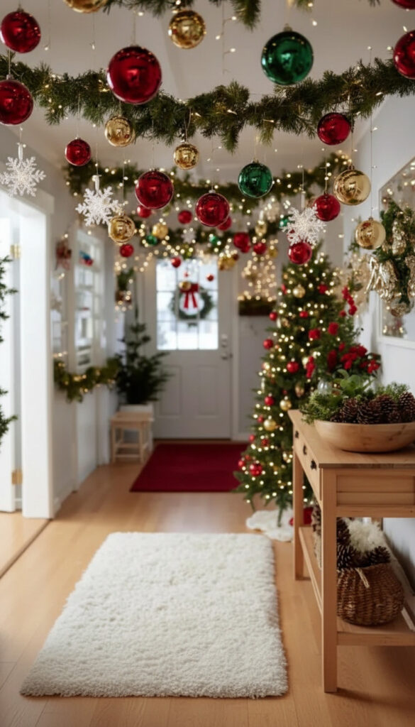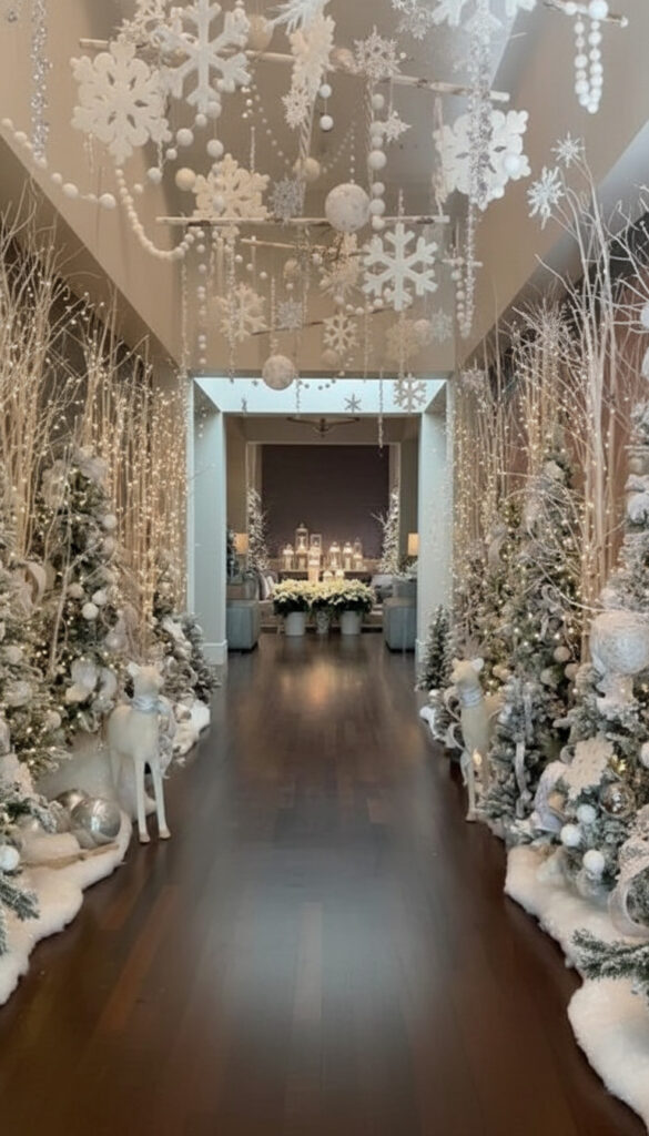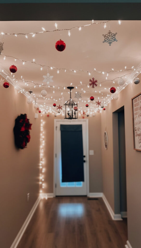 Why This Works: This idea utilizes the often-forgotten “fifth wall”—the ceiling. Hanging snowflakes draw the eye up, making the ceiling feel higher. It turns a corridor into a magical winter wonderland.
