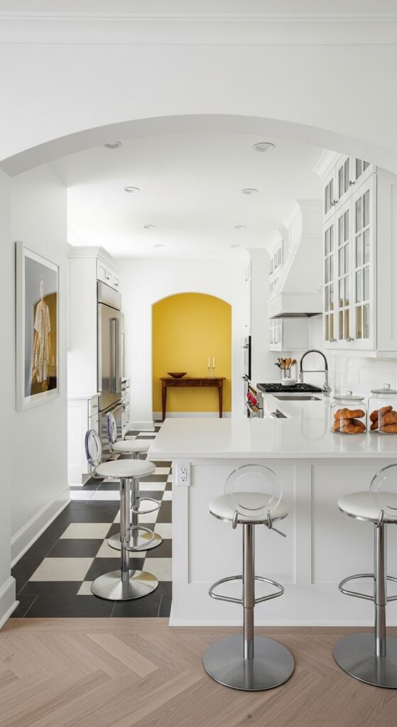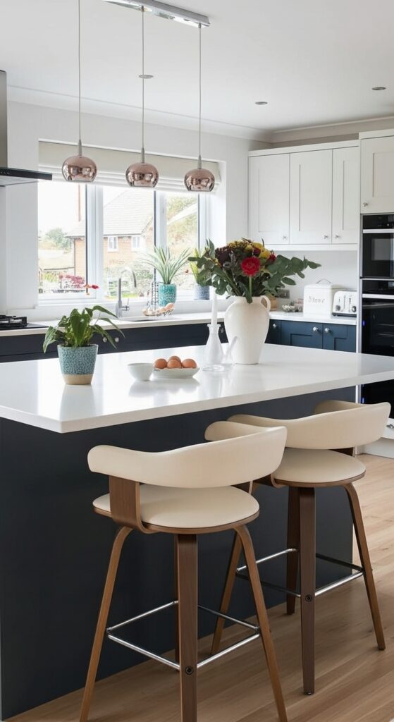 Guests can sit and chat with you while you cook. It’s a brilliant solution for entertaining. Just add a two or three stylish bar stools. This simple addition makes the kitchen more inviting.
