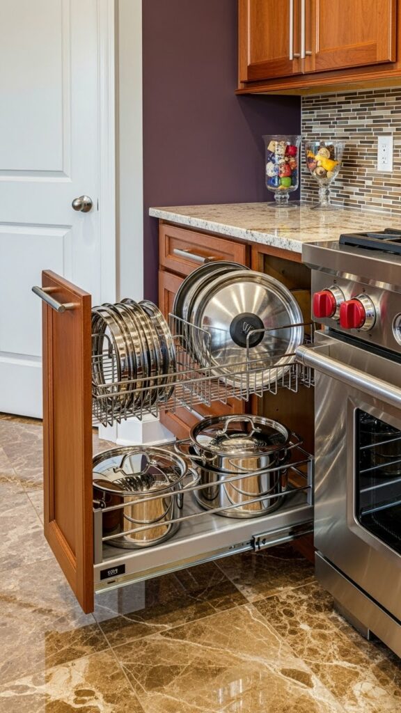 Pot lids are arguably the hardest item to store neatly. They slide off stacks and create a loud racket.