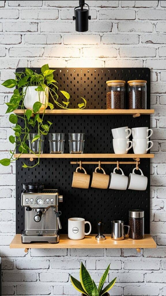 Install a pegboard to hold pans, utensils, and baskets. These wall-mounted racks are flexible and can change as needed.