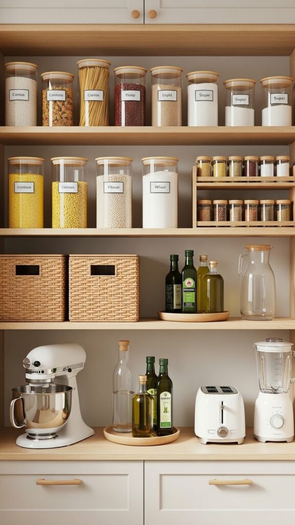 Use a Stackable Can Rack Organizer (36 Cans) to maximize shelf utility. This is one of the easiest pantry organization hacks available.