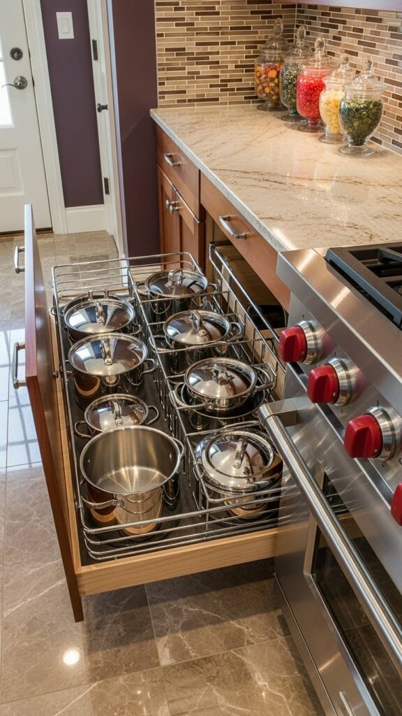 Pots and pans take up massive amounts of cabinet space. Stacking them often damages non-stick surfaces and makes lids hard to find.