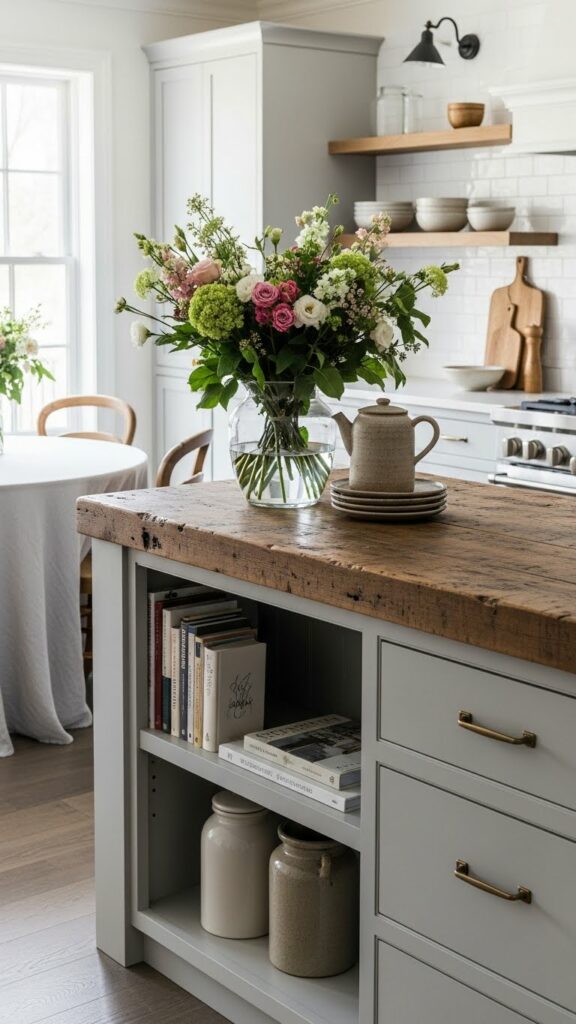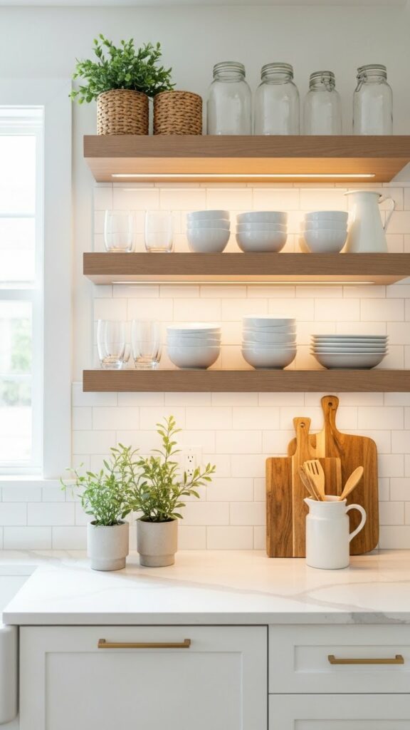 Replace a cabinet section with floating shelves. Use them to display pretty dishes or frequently used ingredients.
