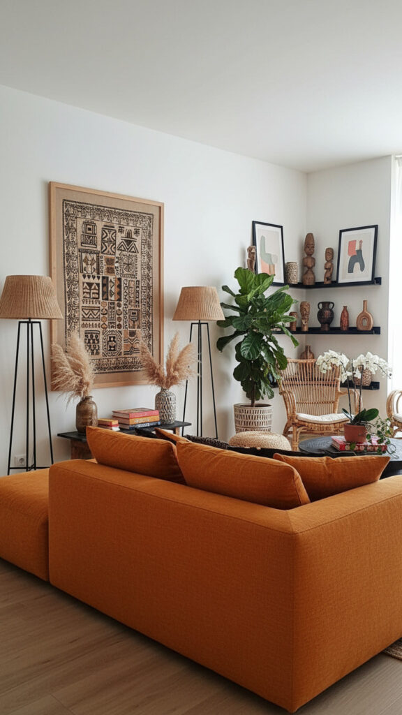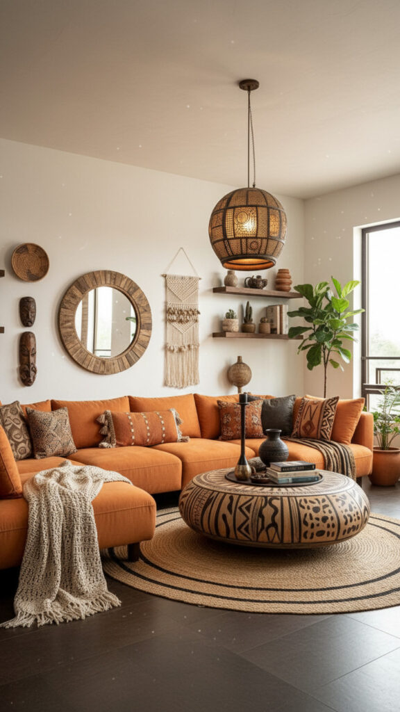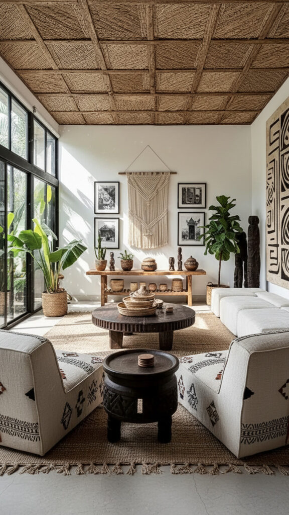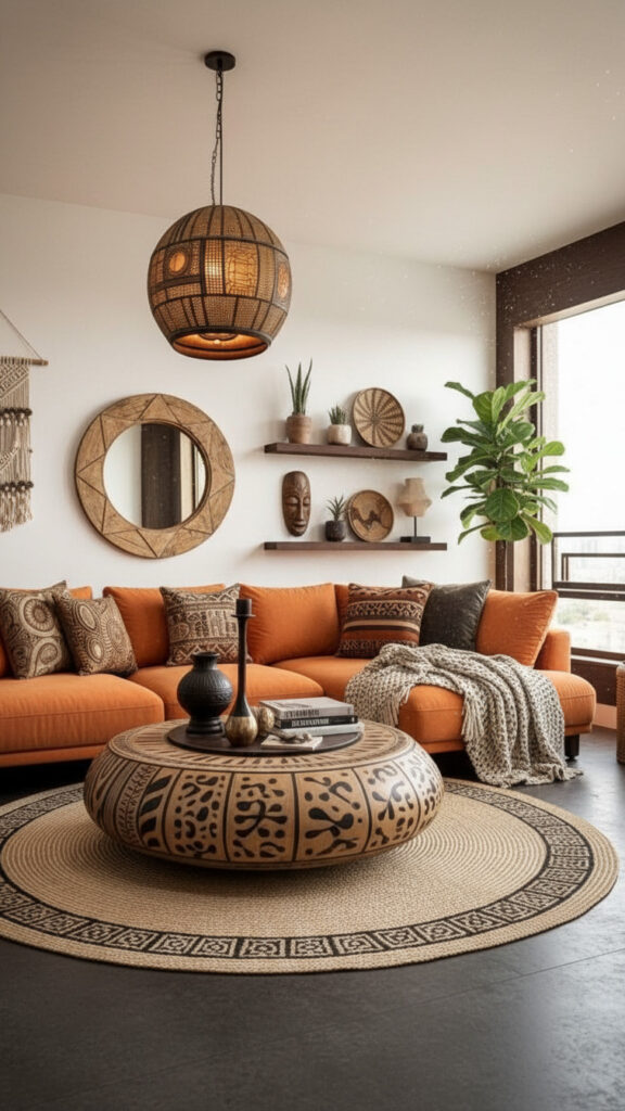 Modern design often feels cold because of its reliance on glass and metal. Afrohemian style counters this with monolithic wood. A solid, raw-edged coffee table or a thick, carved Sénoufo stool provides the necessary warmth. The “Modern” twist is to pair these rugged, heavy wood pieces with sleek, thin-profile furniture, such as a velvet sofa with needle-thin brass legs. This tension between heavy and light is the secret to a balanced Modern Afroho room.