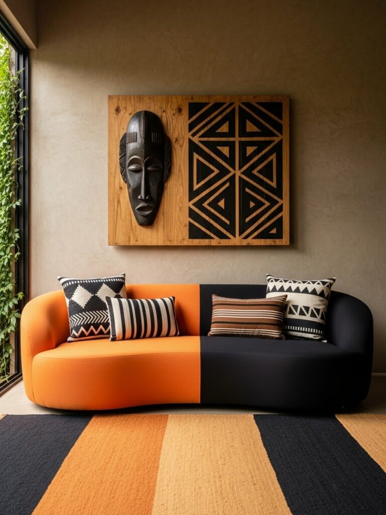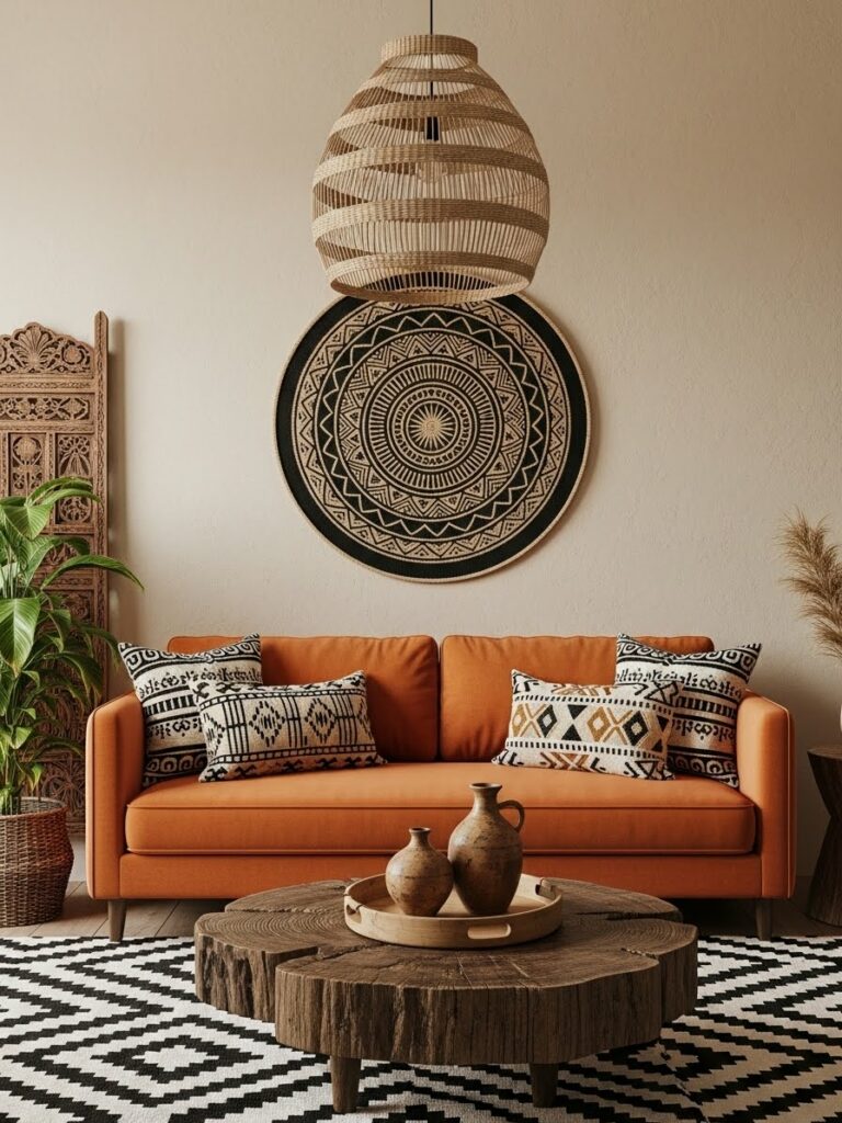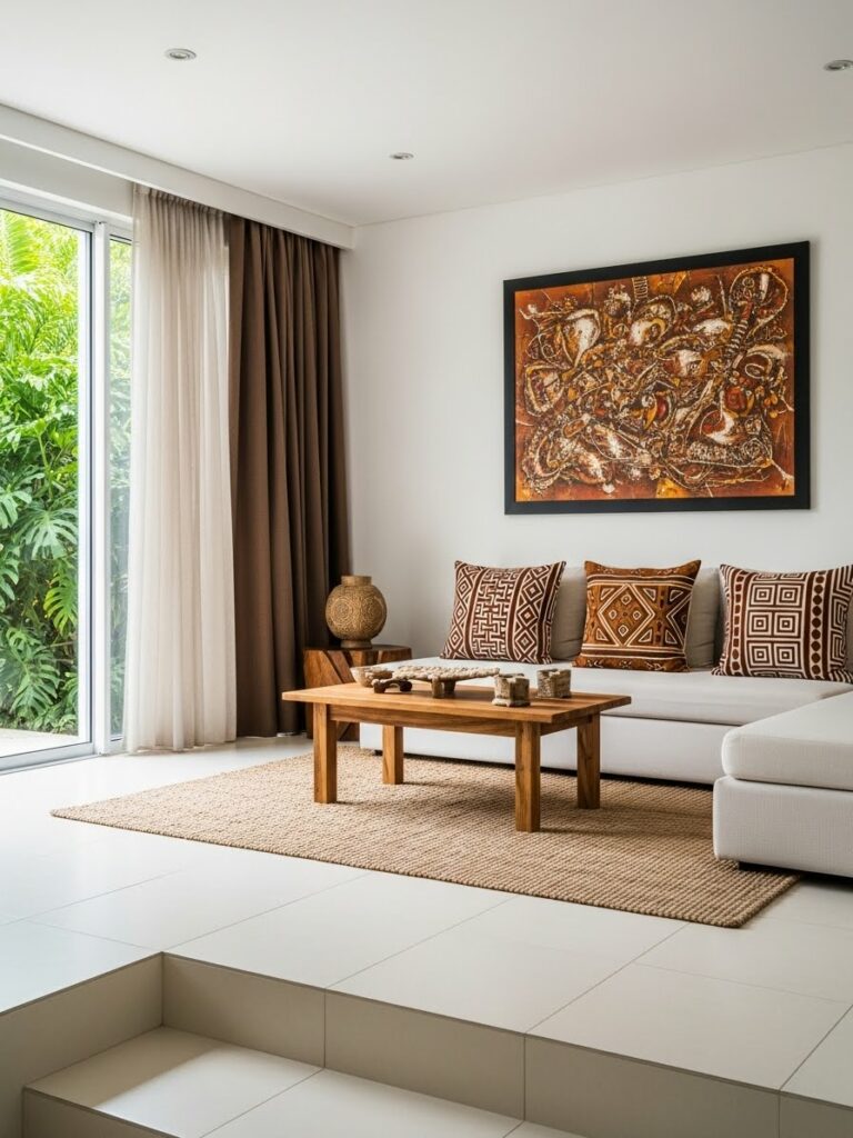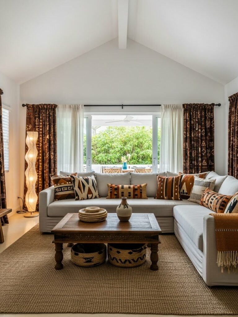 Modernity thrives on geometric patterns. Look for tribal prints that have been simplified or “blown up” in scale. A large-scale, repeating diamond motif on a Geometric Tribal Cotton Area Rug or a series of simple line-work prints on linen curtains provides a subtle nod to African weaving traditions while maintaining a clean, contemporary look. This “minimalist tribal” approach prevents the room from feeling like a period piece and keeps it firmly in the present.