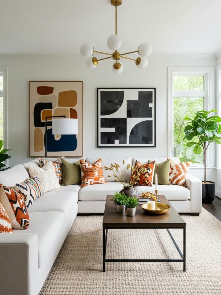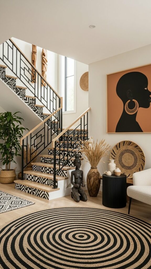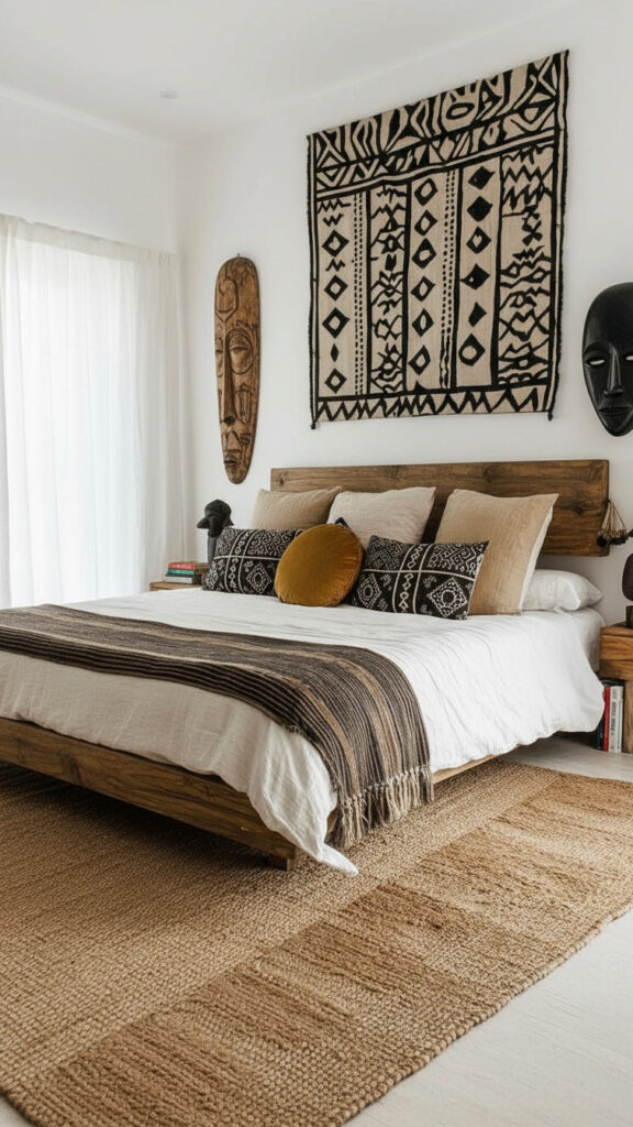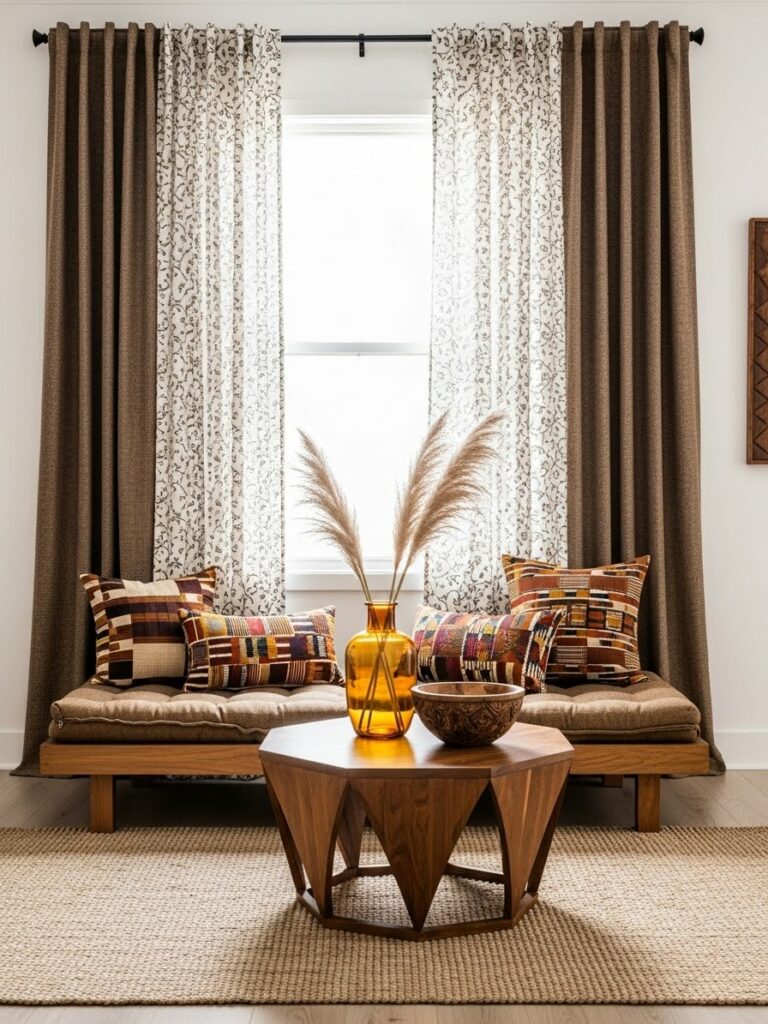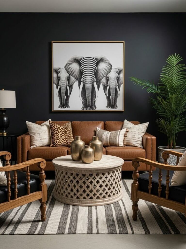 Modernity thrives on geometric patterns. Look for tribal prints that have been simplified or “blown up” in scale. A large-scale, repeating diamond motif on a Geometric Tribal Cotton Area Rug or a series of simple line-work prints on linen curtains provides a subtle nod to African weaving traditions while maintaining a clean, contemporary look. This “minimalist tribal” approach prevents the room from feeling like a period piece and keeps it firmly in the present.