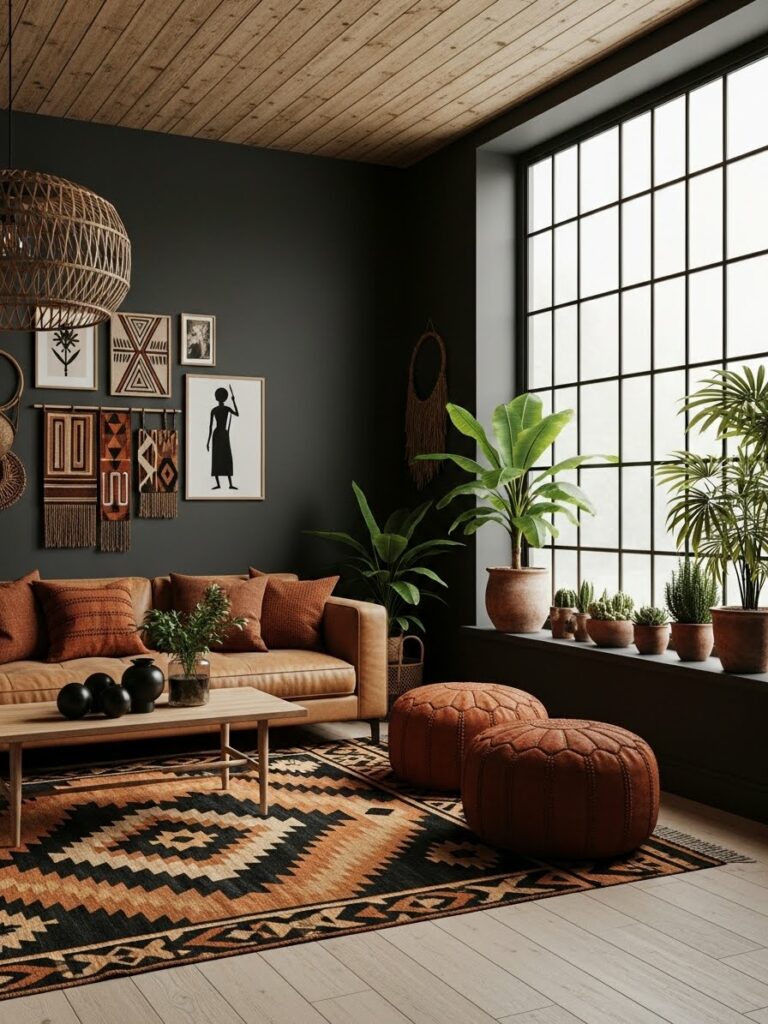 Modern design often needs a “touch of black” to ground the space. In Modern Afrohemian decor, use matte black in your accessories—think a Matte Black Ceramic Vase Set, black-framed masks, or even a black-stained wood coffee table. This high-contrast element anchors the lighter textiles and earthy tones, giving the room a sense of visual luxury and depth that prevents it from feeling washed out.