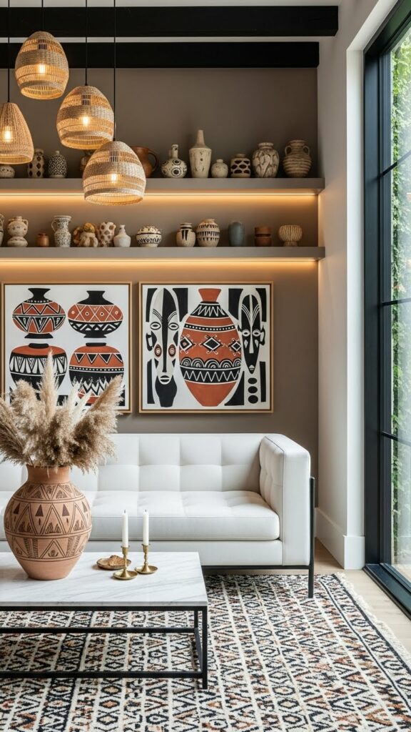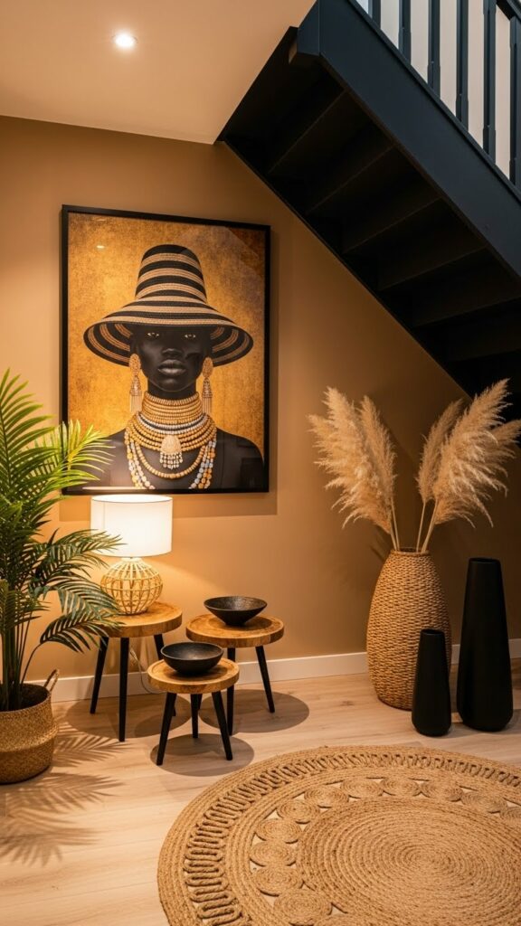 The secret to Modern Afrohemian success is texture-layering. Place a soft wool rug over a rough jute mat. Hang a feathery Juju hat near a smooth ceramic vase. This juxtaposition of different physical sensations makes a room feel rich and immersive. It’s not about how many things you have, but how those things feel when seen together.