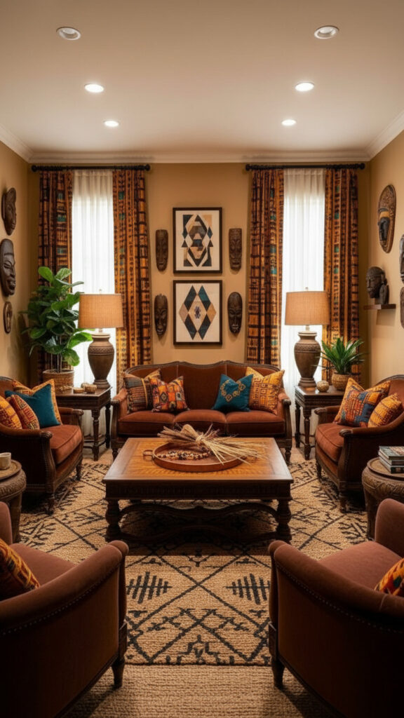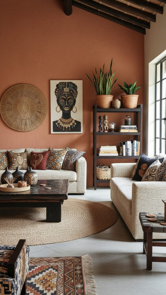 Moving beyond the beige walls of the past, 2026 trends favor “color drenching.” Choose an earthy, saturated hue like terracotta or burnt umber and paint the walls, trim, and even the ceiling in the same matte finish. This creates a cocoon-like environment where your African-inspired textures—like woven baskets or copper bowls—can stand out with high-definition clarity. Saturated colors provide a moody, sophisticated backdrop that feels instantly more high-end than standard off-white.