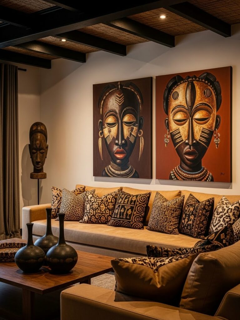 While artifacts are essential, contemporary art keeps the space modern. Look for Abstract Sun & Moon Afrocentric Wall Art that utilizes the colors of the African landscape—deep reds, forest greens, and sun-bleached yellows. These paintings can act as the “anchor” for your room’s color palette, tying together the various textile and wood elements into a cohesive visual narrative.