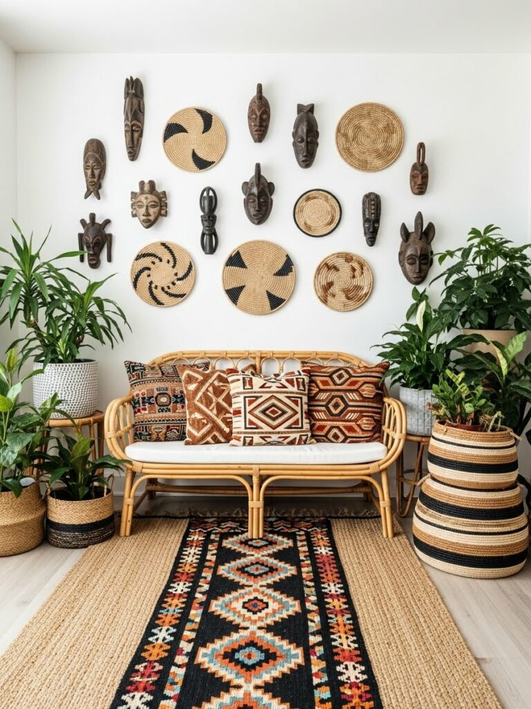A collection of masks from different regions—Dogon, Fang, or Baule—creates an intellectual vertical focal point. In a modern space, hang them with significant distance between each piece to emphasize their individual shapes and meanings. This “spacing” is what differentiates a modern gallery from a cluttered flea-market look.