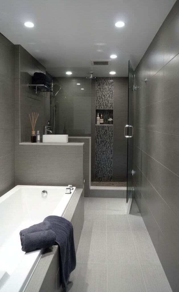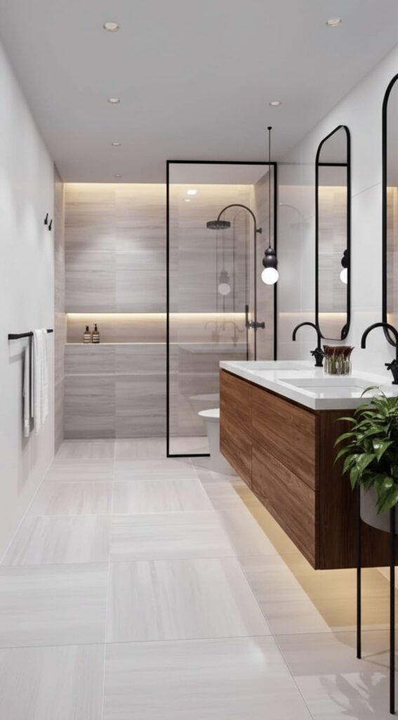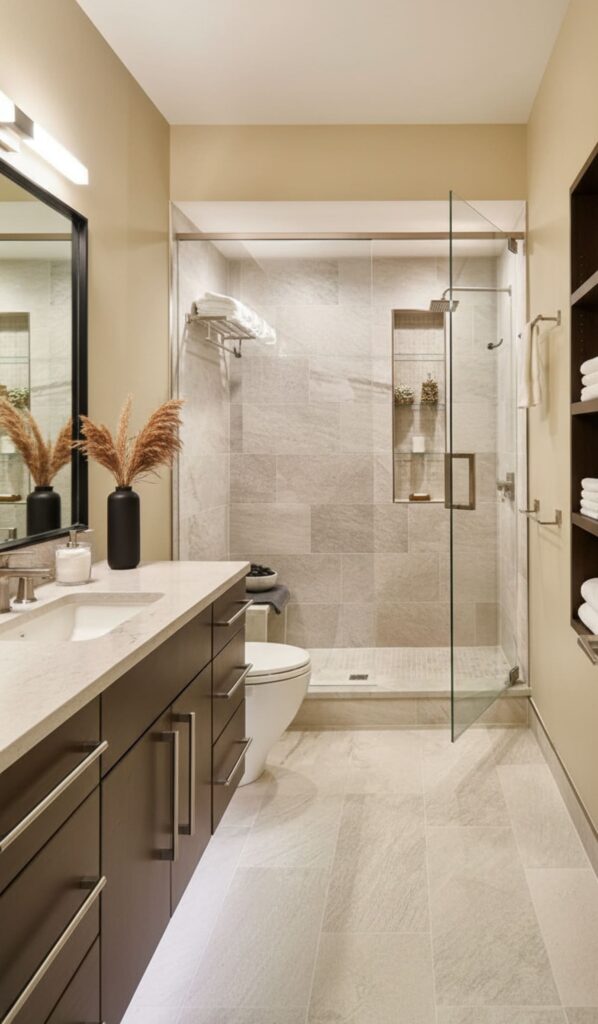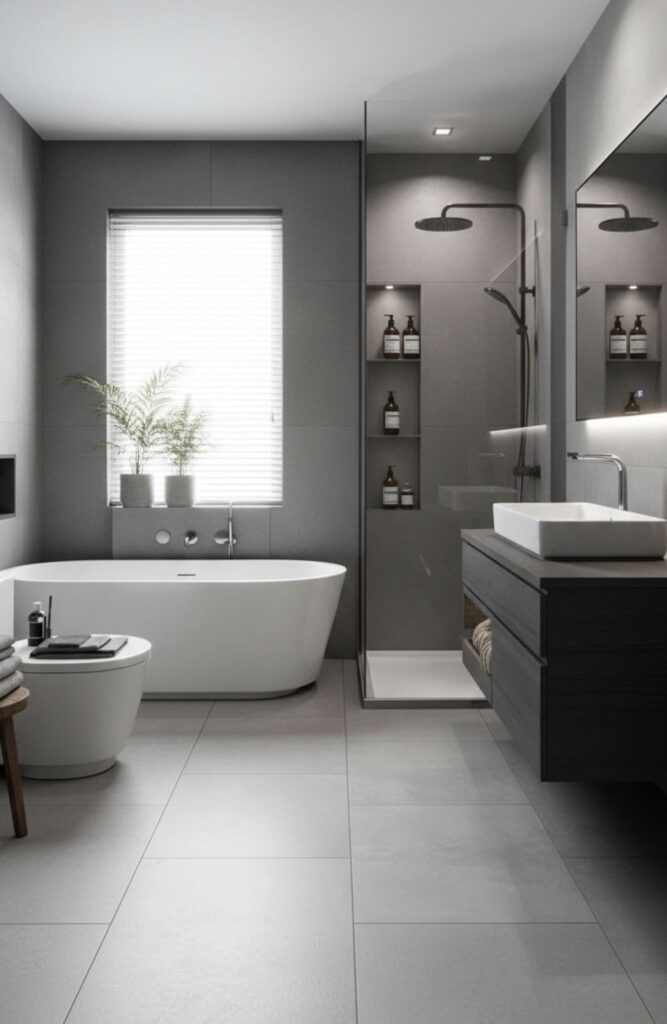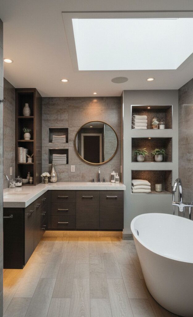 Decluttering is essential for a modern look. Keep surfaces clear by maximizing hidden storage. Use built-in niches in the shower area.