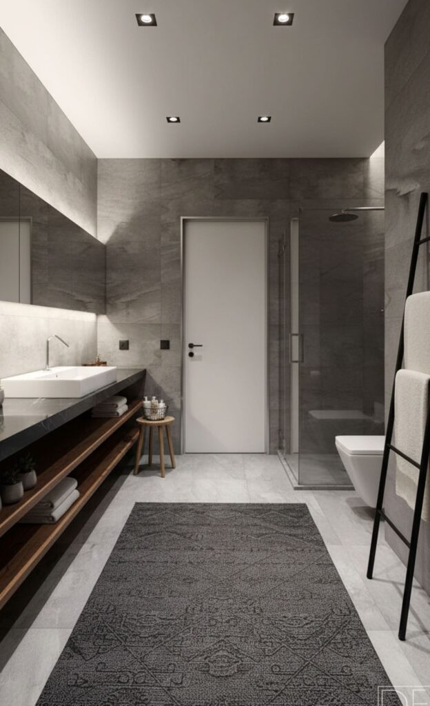 Keep the color palette moody. Greys, blacks, and whites are staples. Soften it with fluffy towels and warm light.