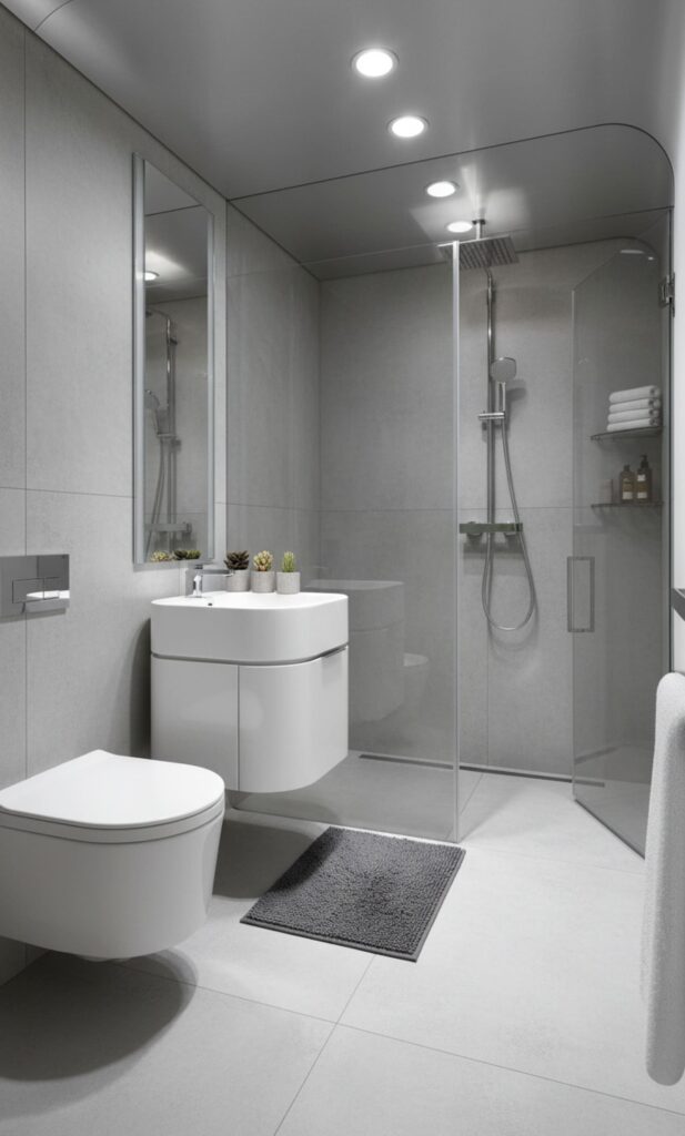 Modern design often leans towards minimalist bathroom aesthetics. However, this does not mean boring. You should select a limited neutral color palette to start.