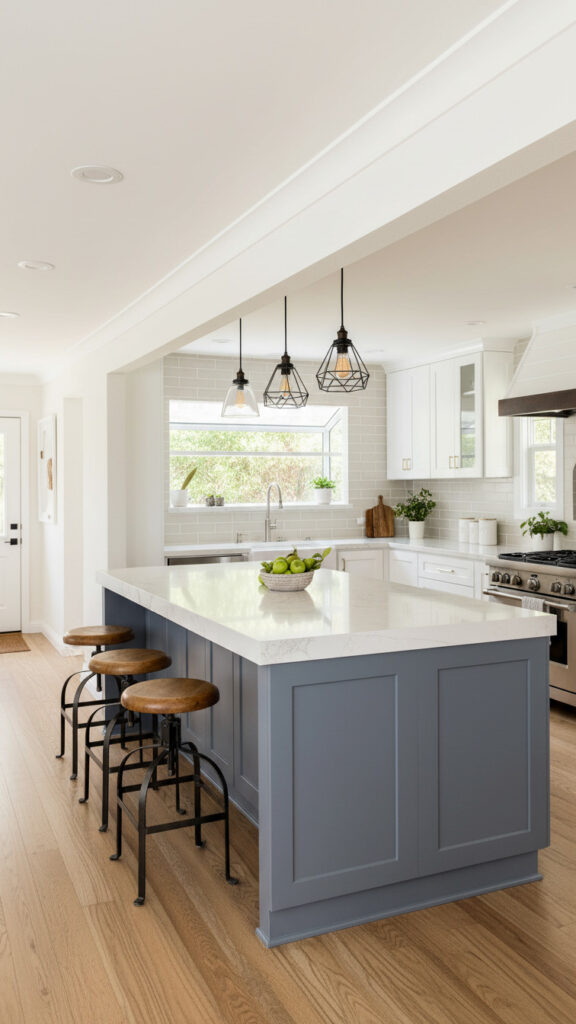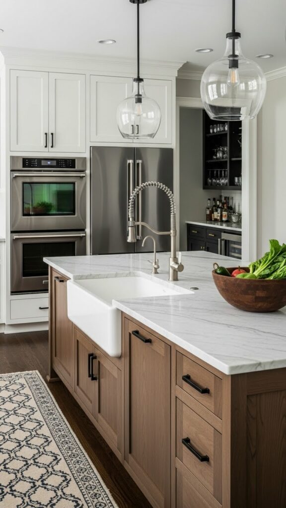If your perimeter is painted, make the island stained wood. A walnut or white oak island warms up a painted kitchen instantly.