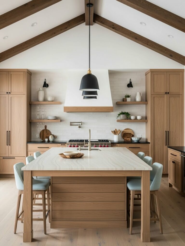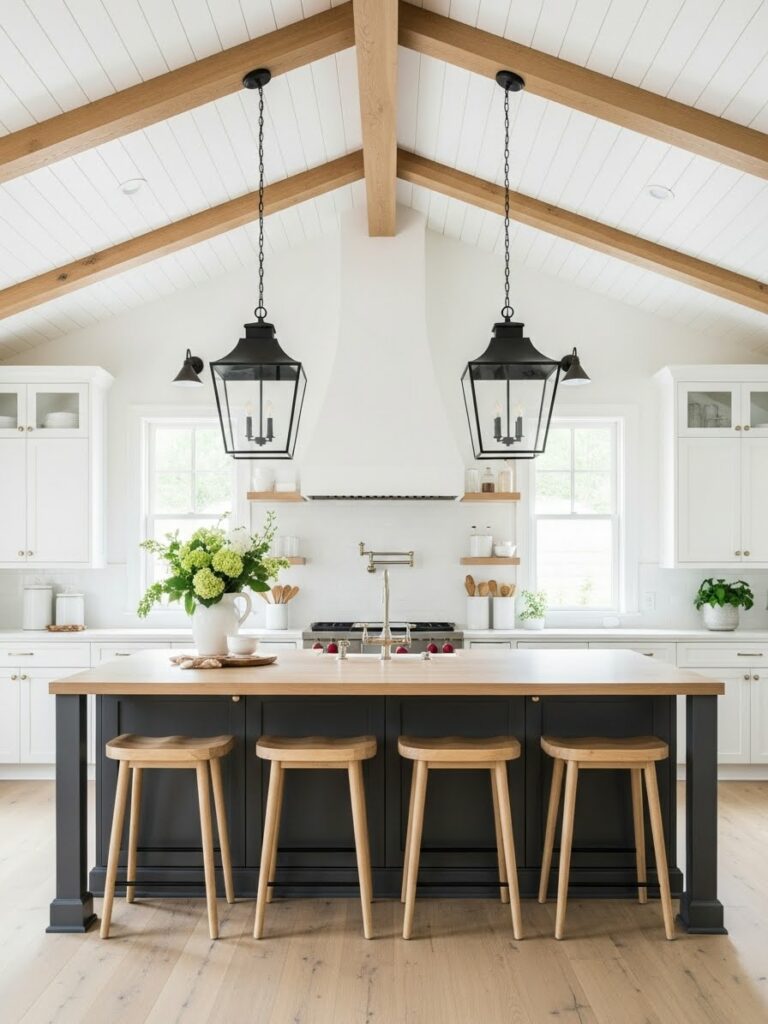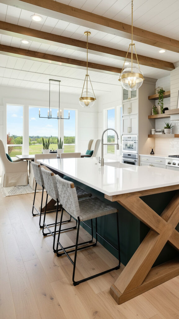Exposed beams are the hallmark of the farmhouse aesthetic. In modern designs, we prefer them to be structural or high-quality faux wood. Stain them in a light oak tone to keep the room airy.