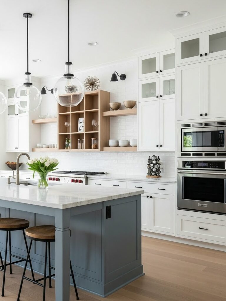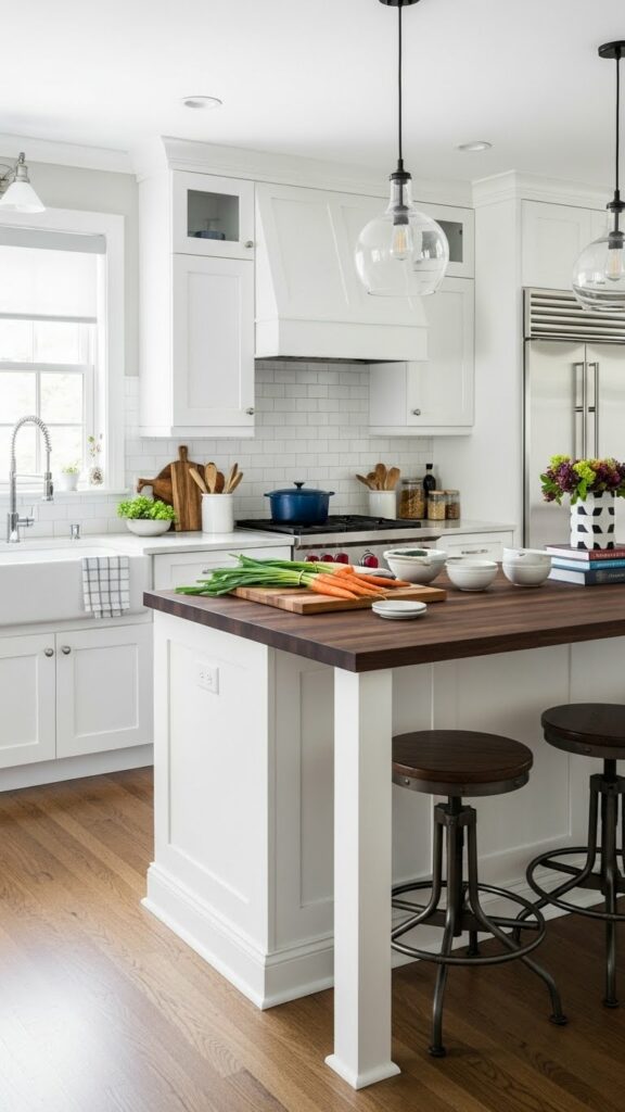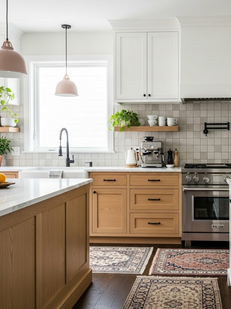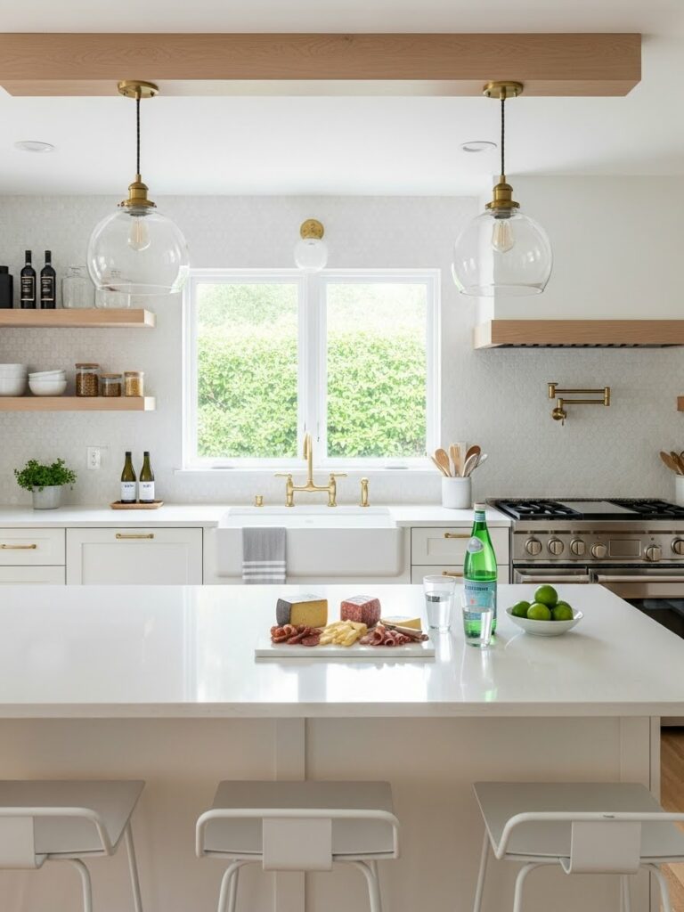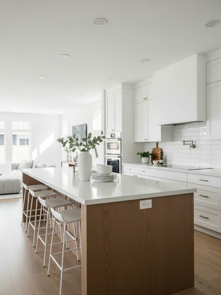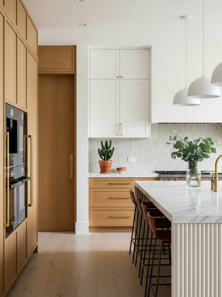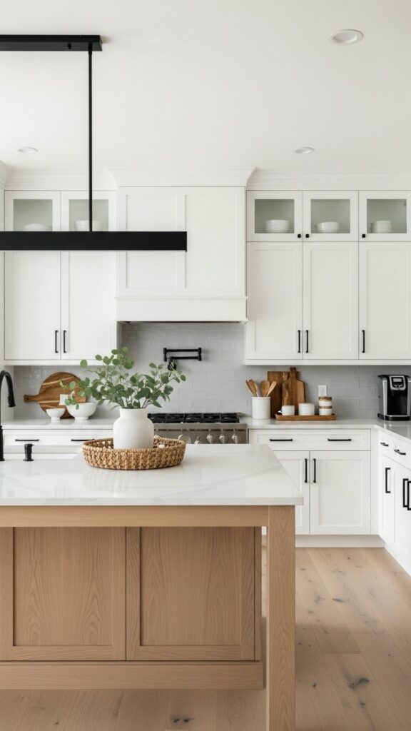 This is the spiritual successor to the all-white kitchen. It uses warmer whites and natural woods to avoid the “hospital” vibe.