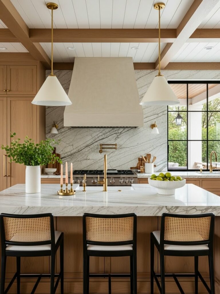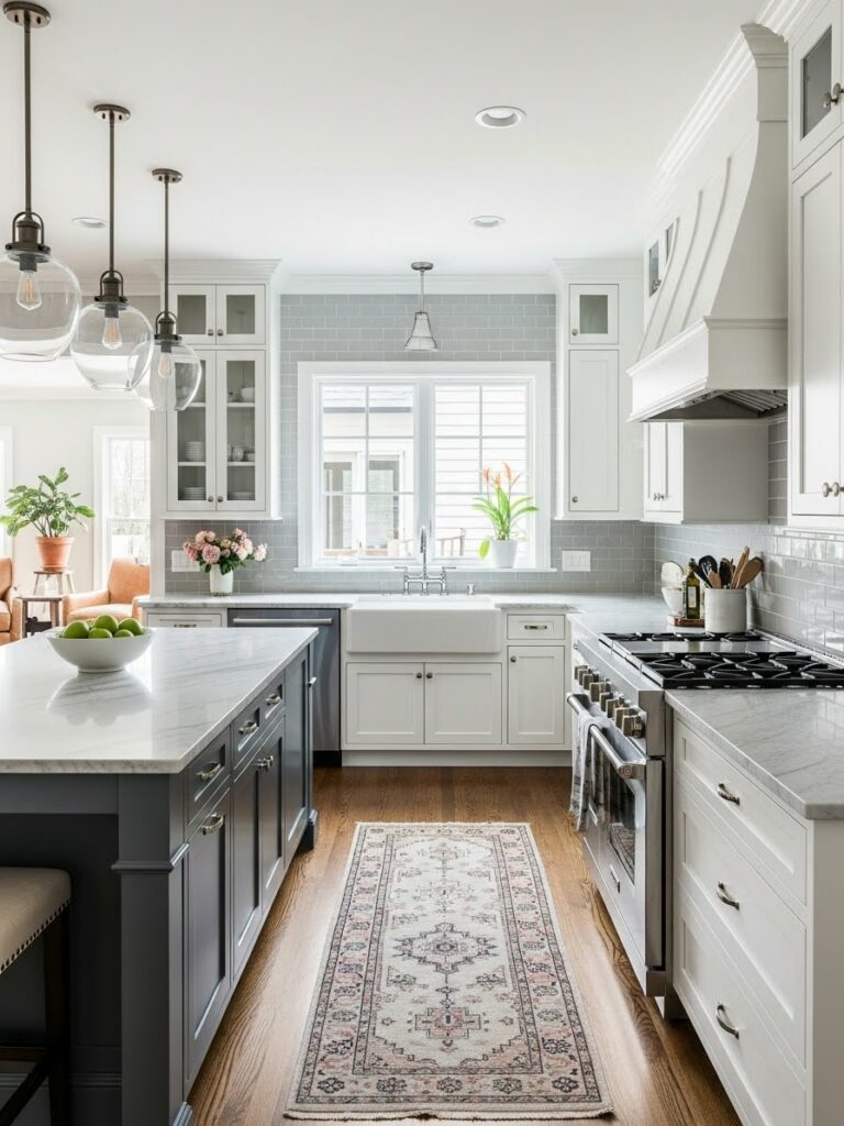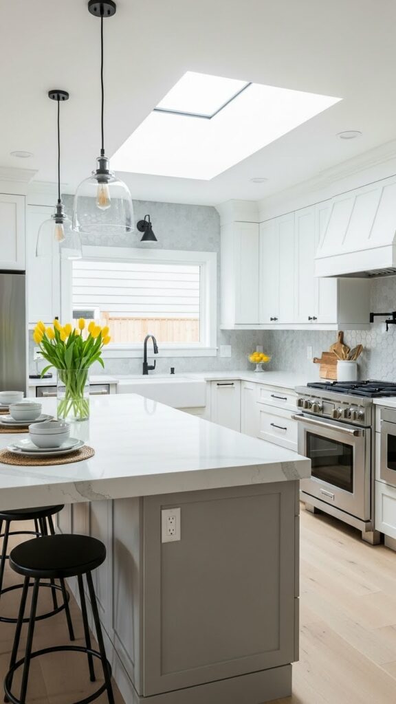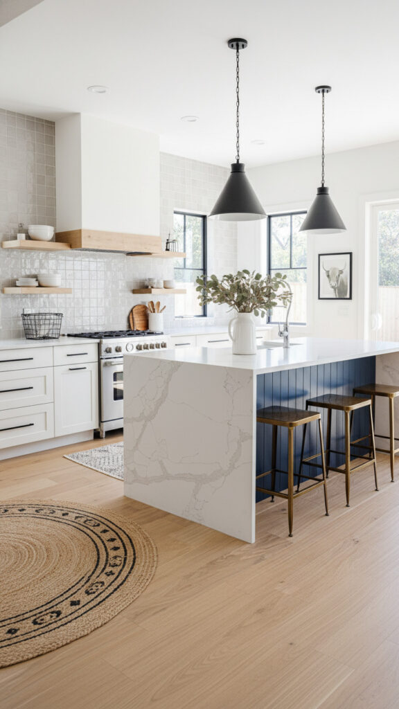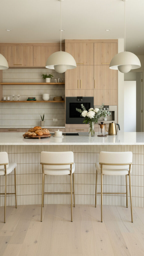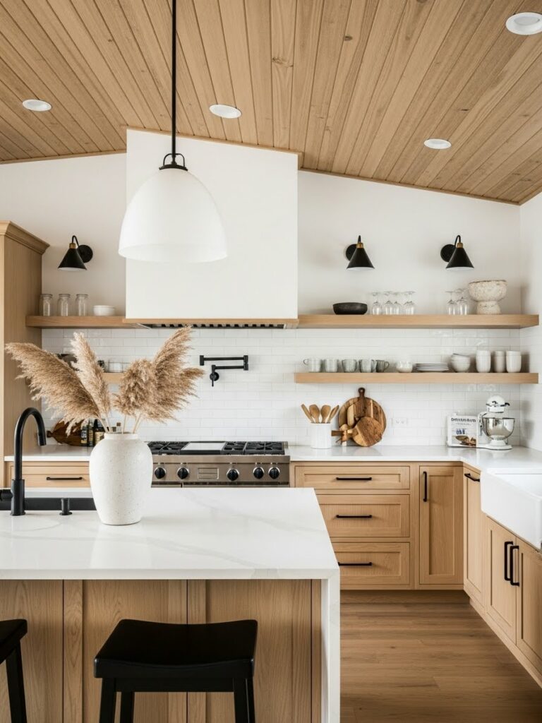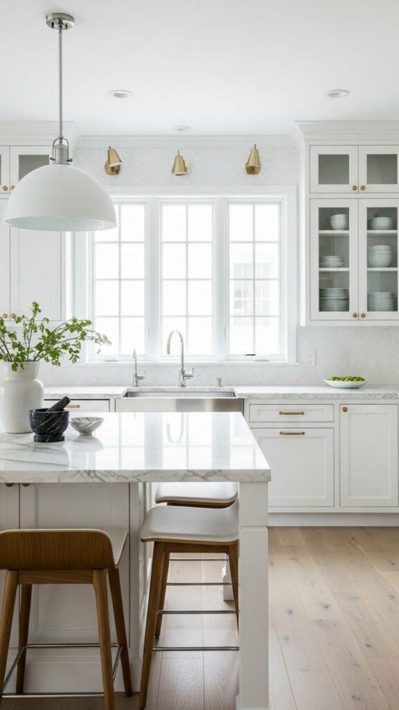 This is the spiritual successor to the all-white kitchen. It uses warmer whites and natural woods to avoid the “hospital” vibe.