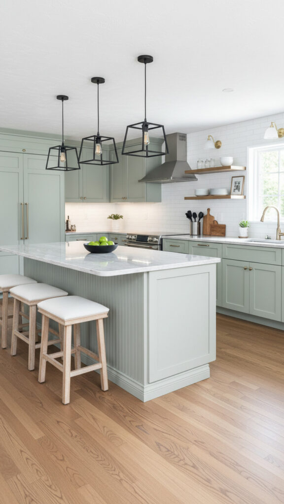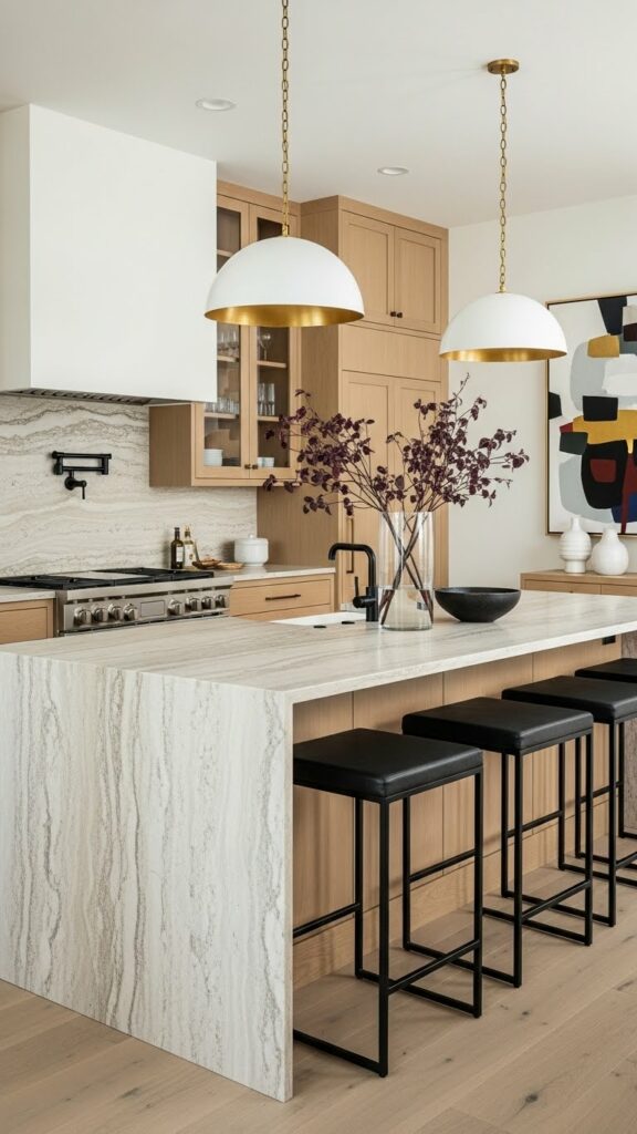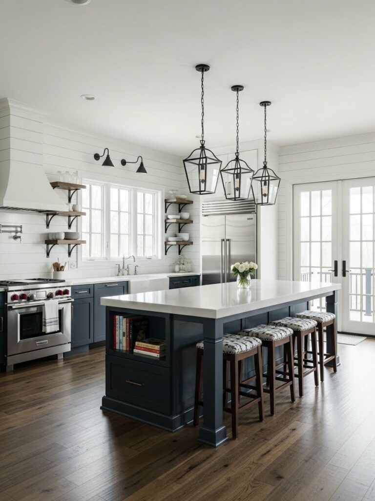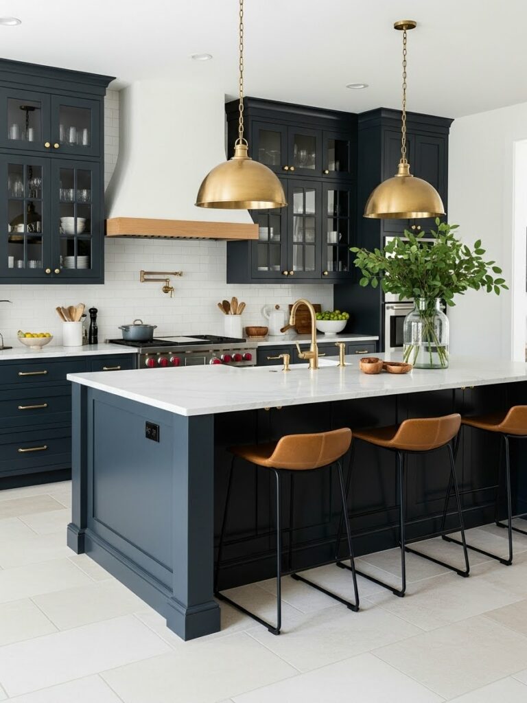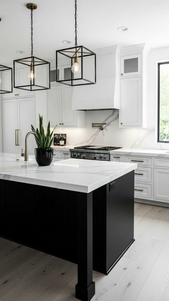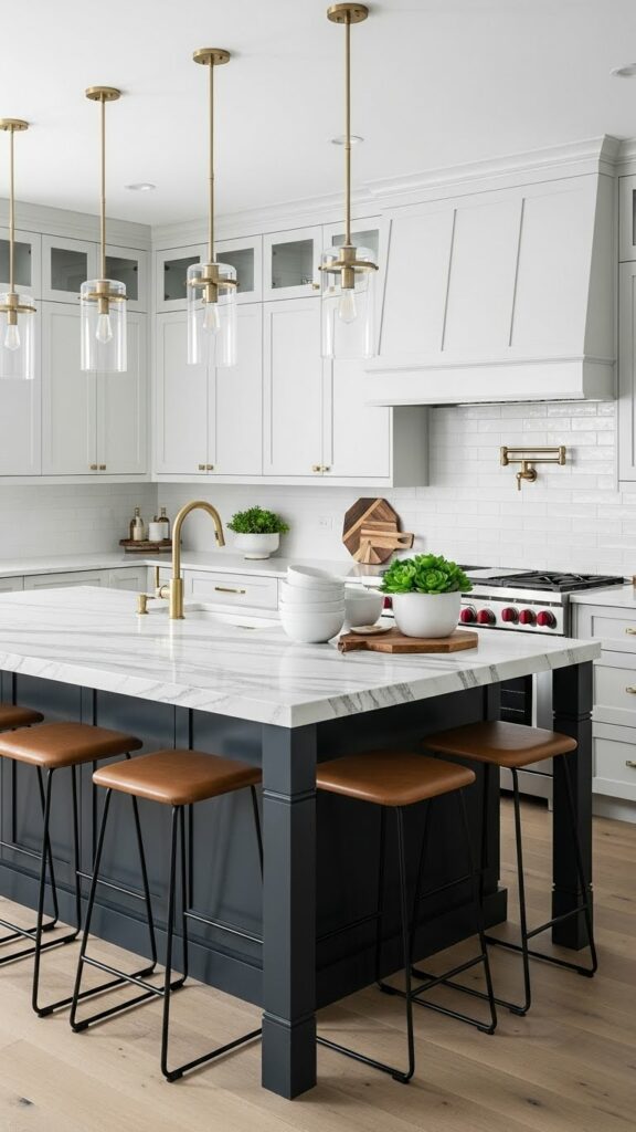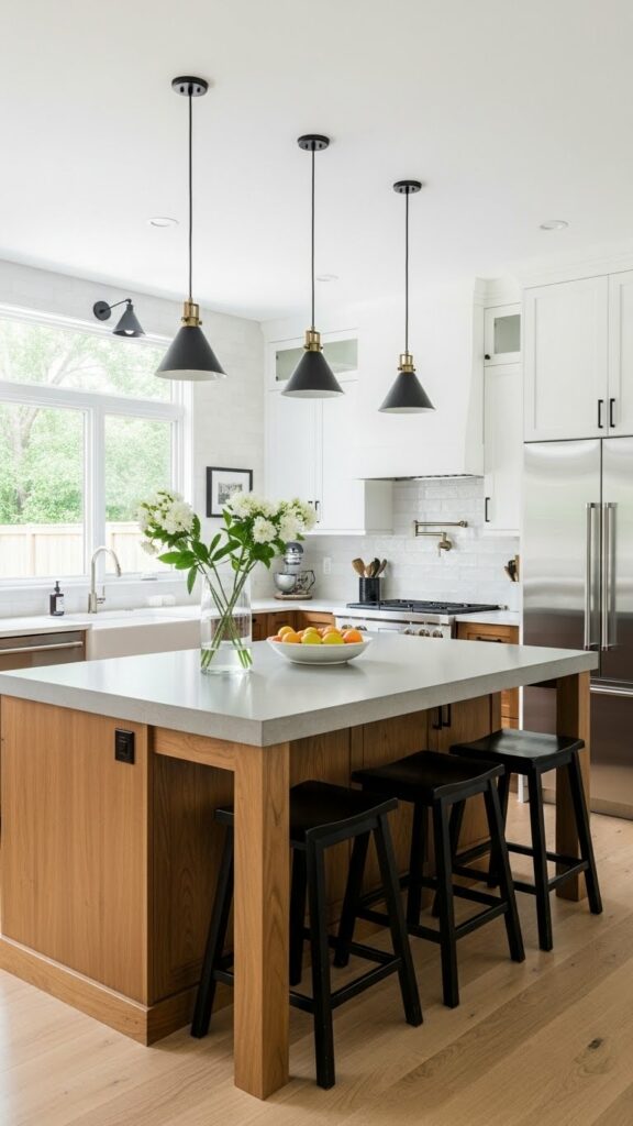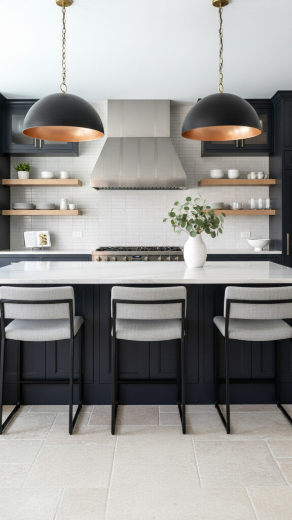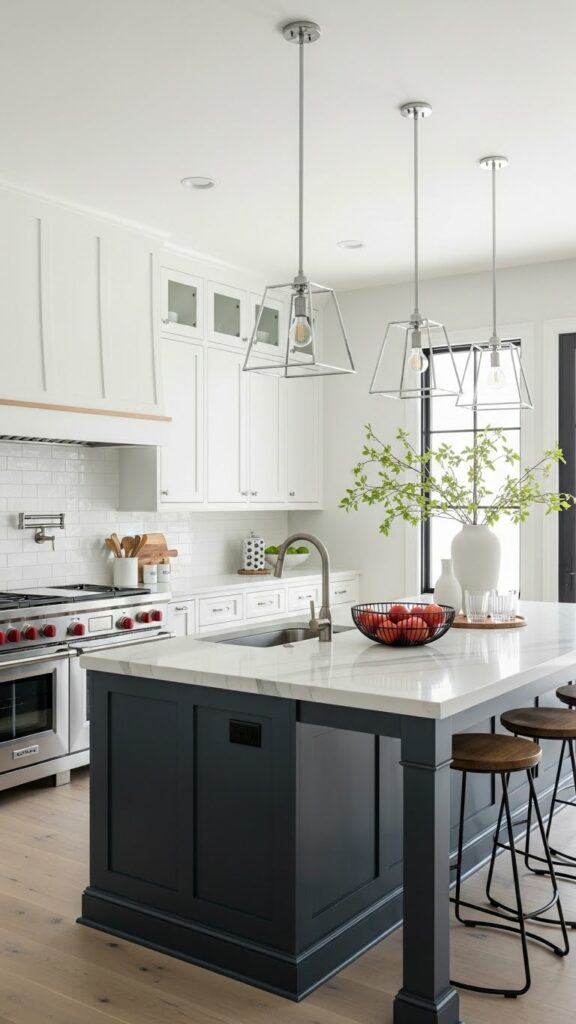Hang large metal domes over the island. Matte black is a strong choice. Brass adds warmth.