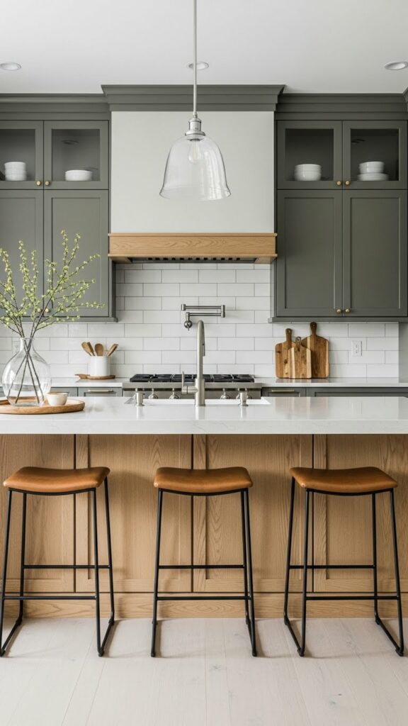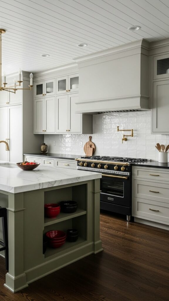 - Black or Charcoal: For the island or base cabinets.