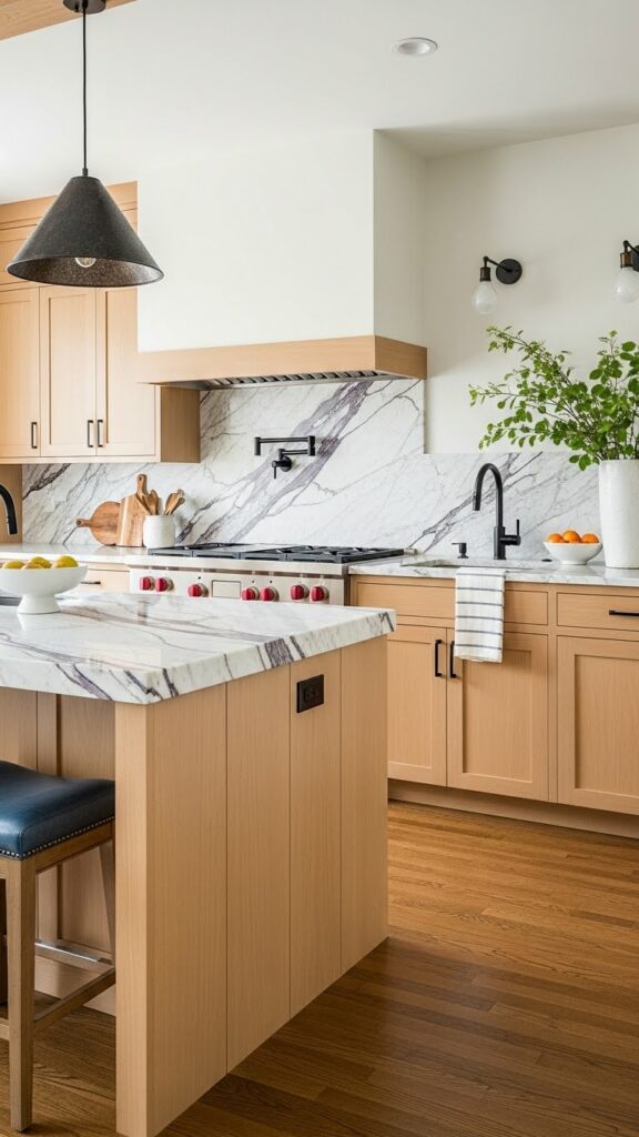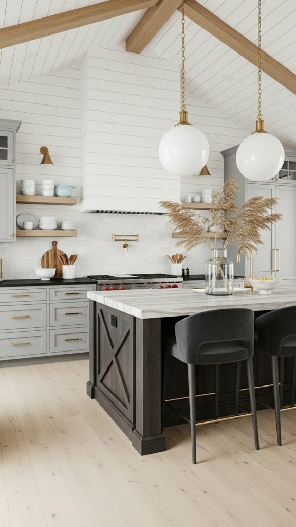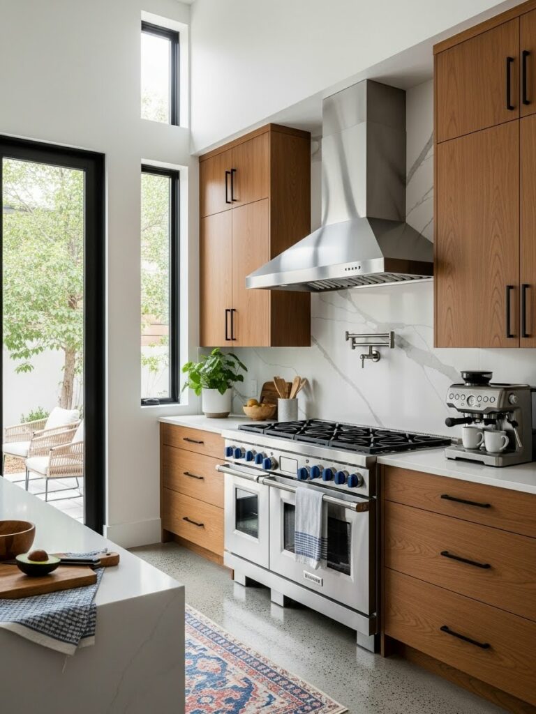 Pair stainless steel appliances (cool) with brass hardware (warm). Use matte black light fixtures to bridge the gap.