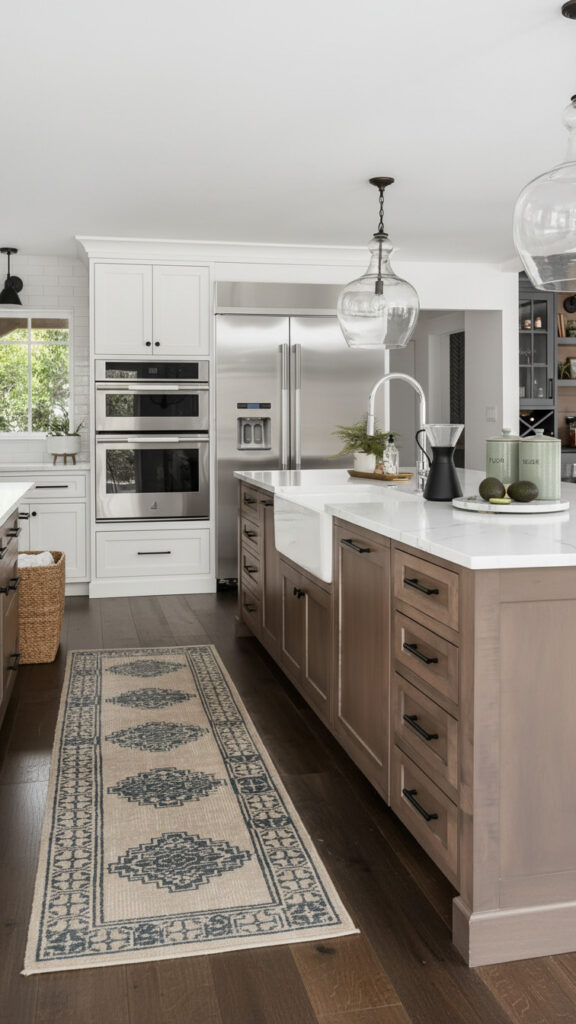 Place a faded Turkish rug between the island and the sink. It adds pattern and comfort underfoot.
