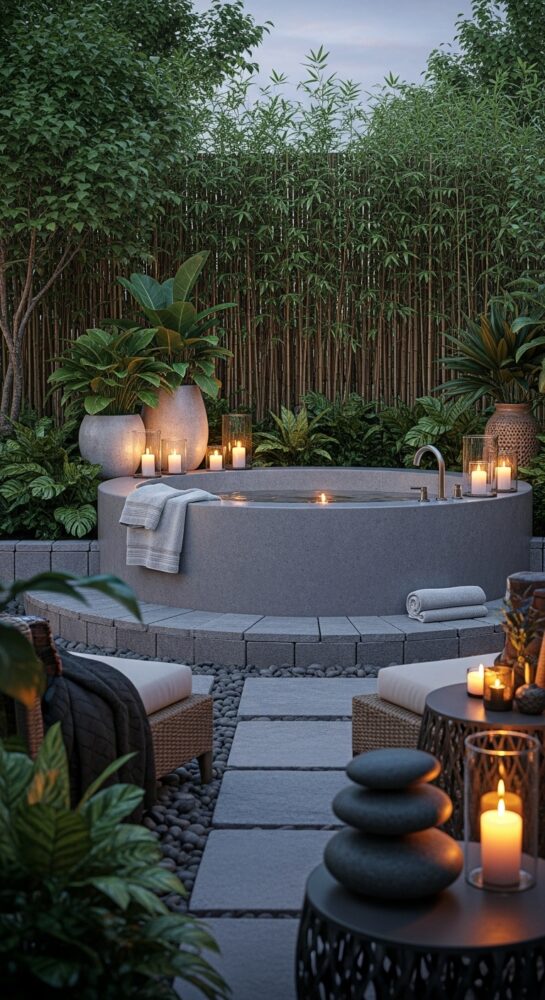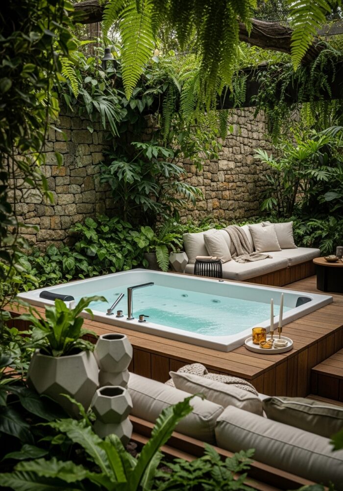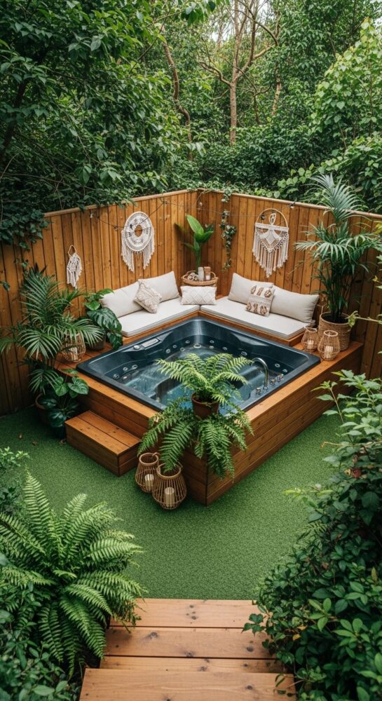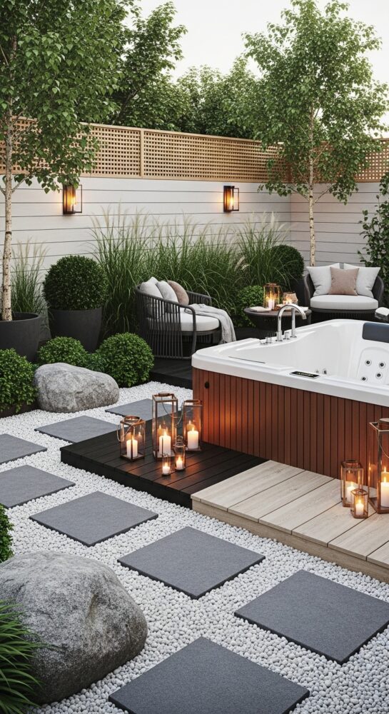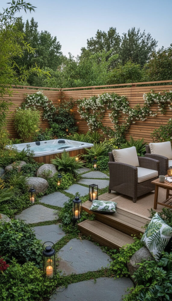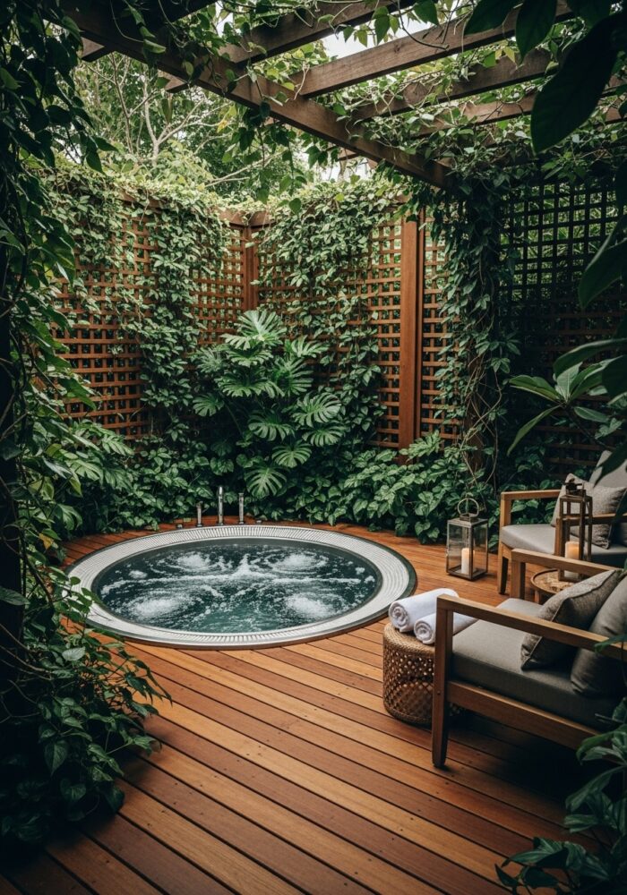 Lay a stone or paver path leading from the door to the tub. This is a practical element of backyard spa ideas.
