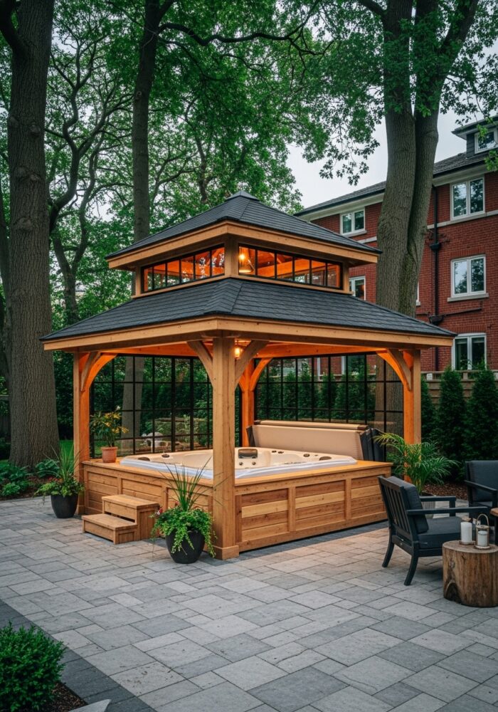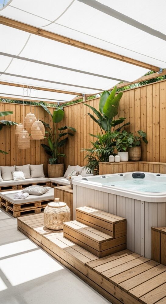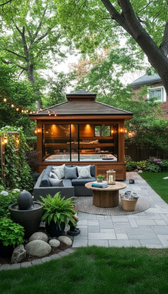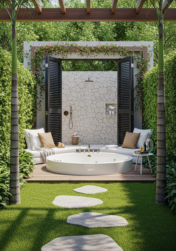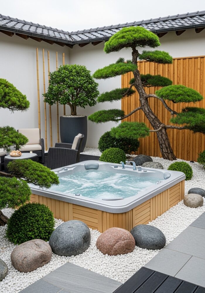 Lay a stone or paver path leading from the door to the tub. This is a practical element of backyard spa ideas.