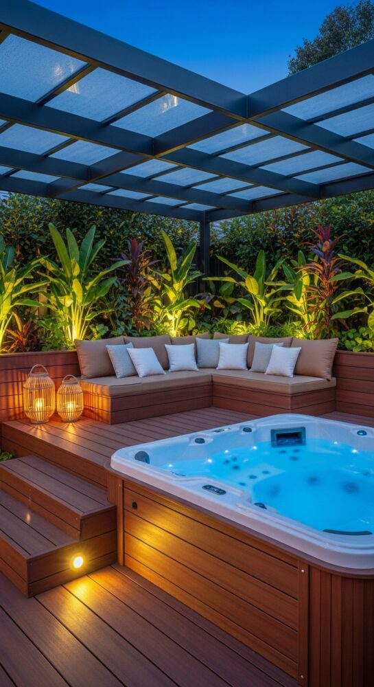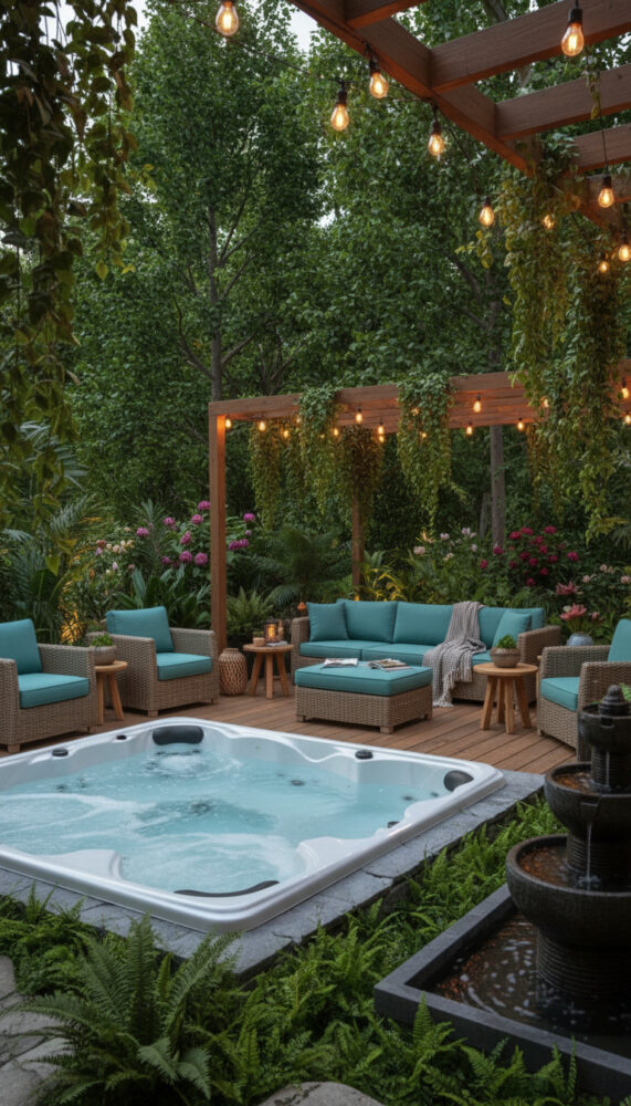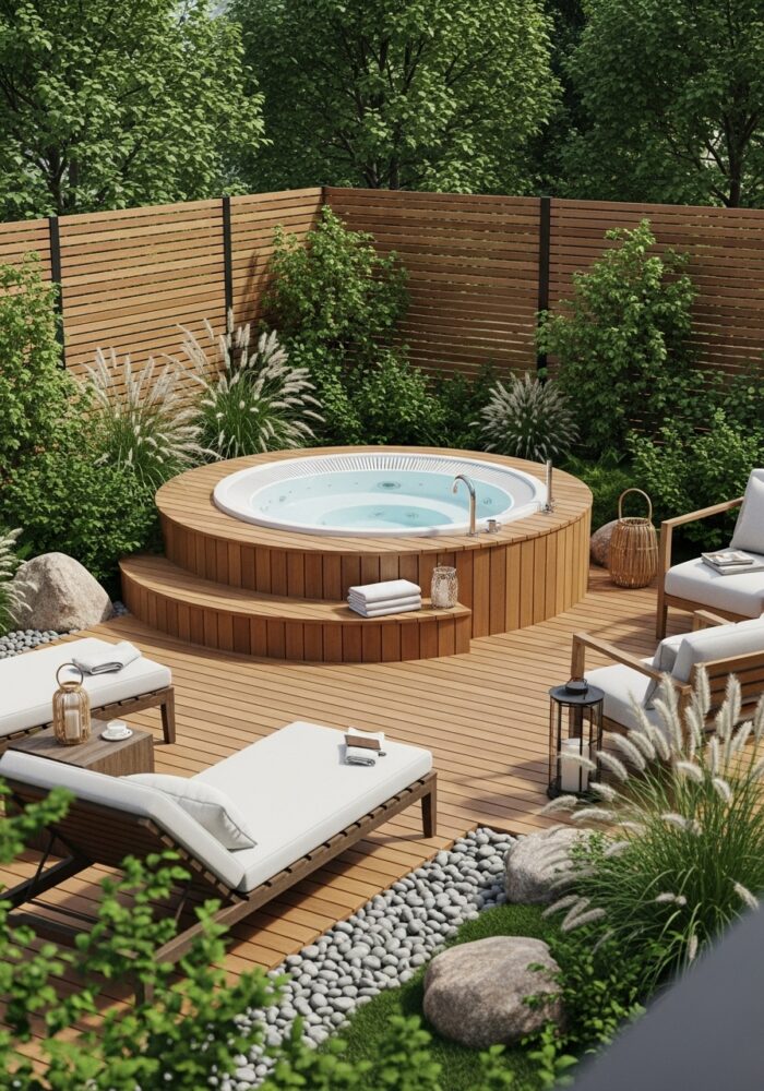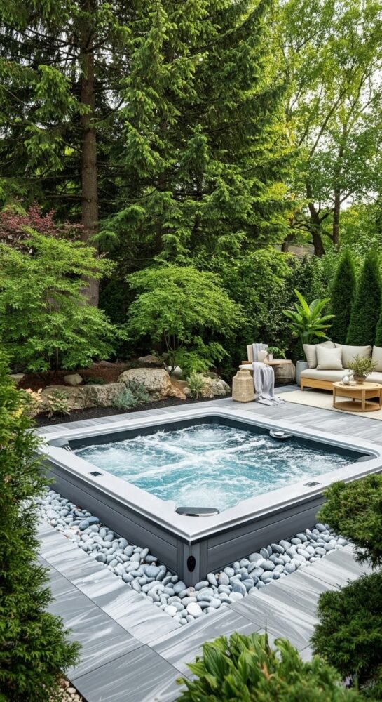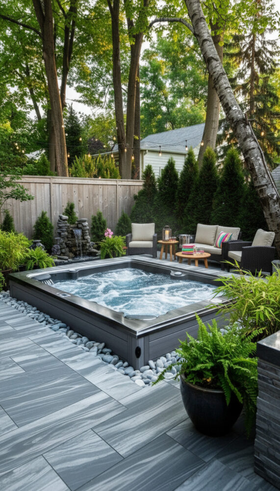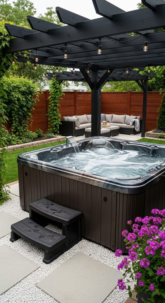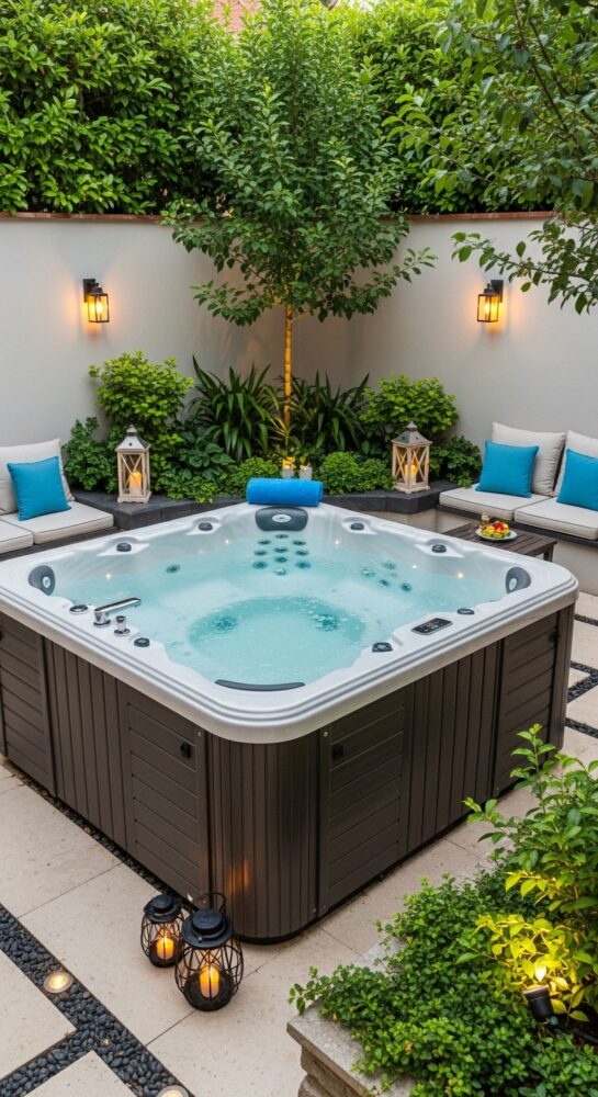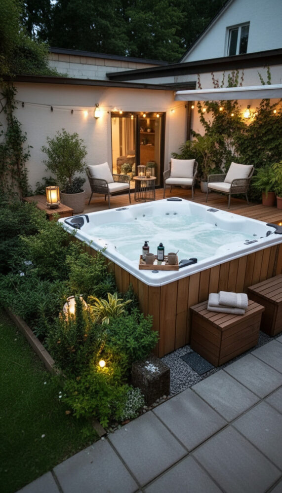 Place weather-resistant lounge chairs or a bench next to the spa. This creates a social zone for entertaining.