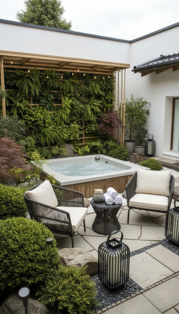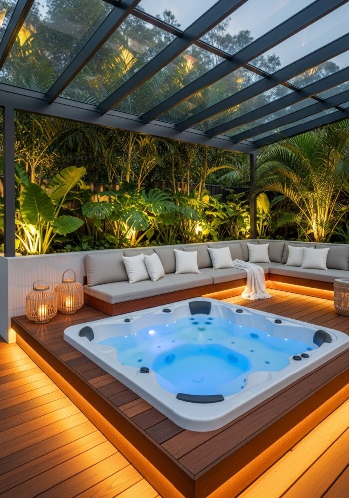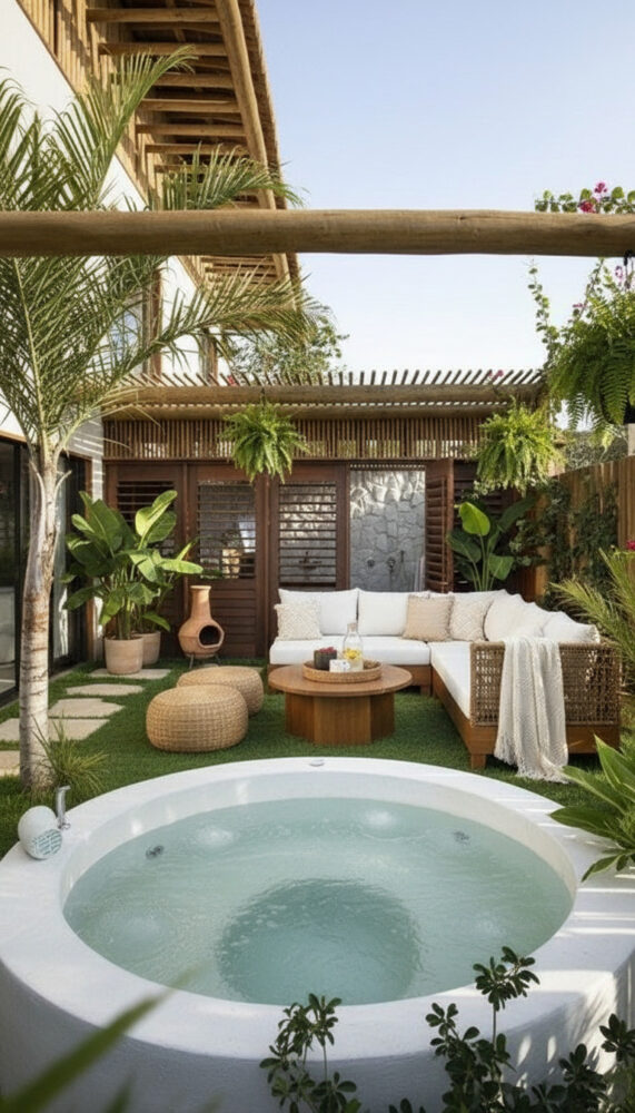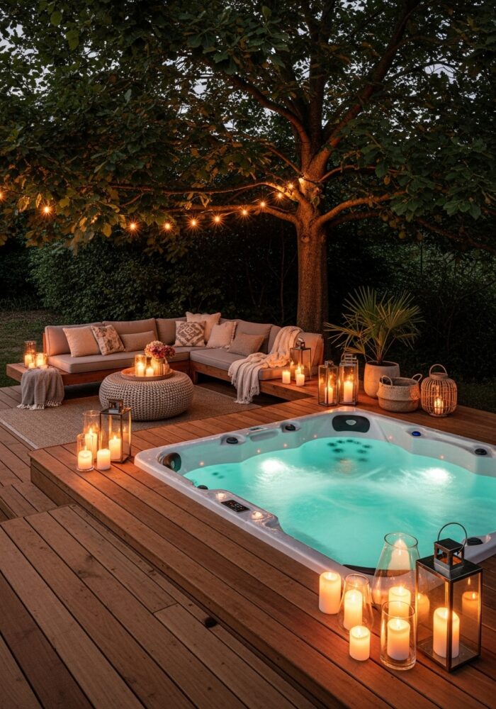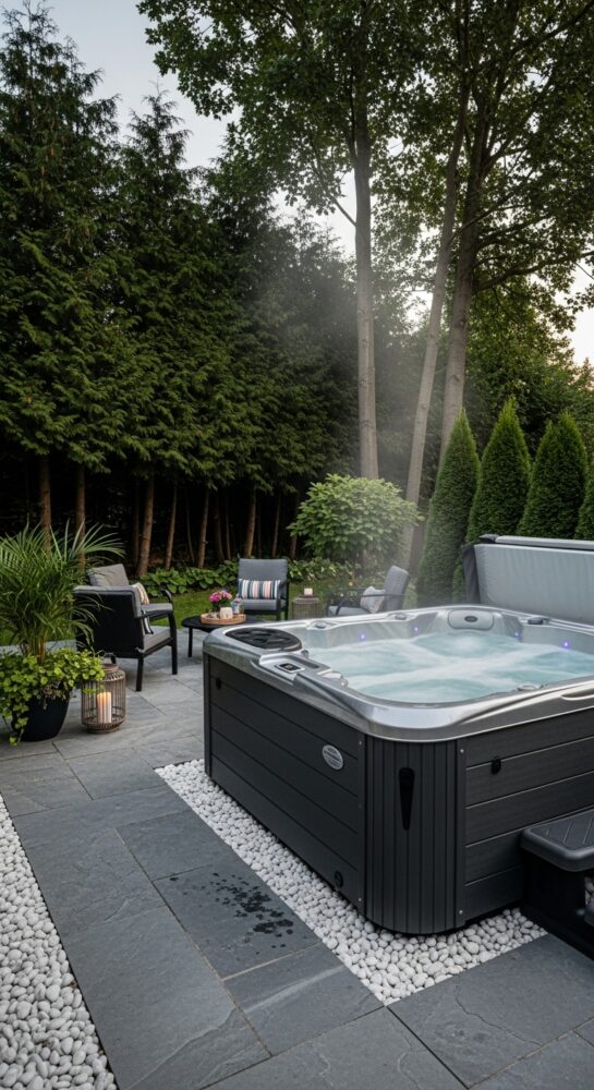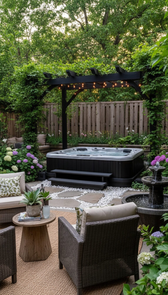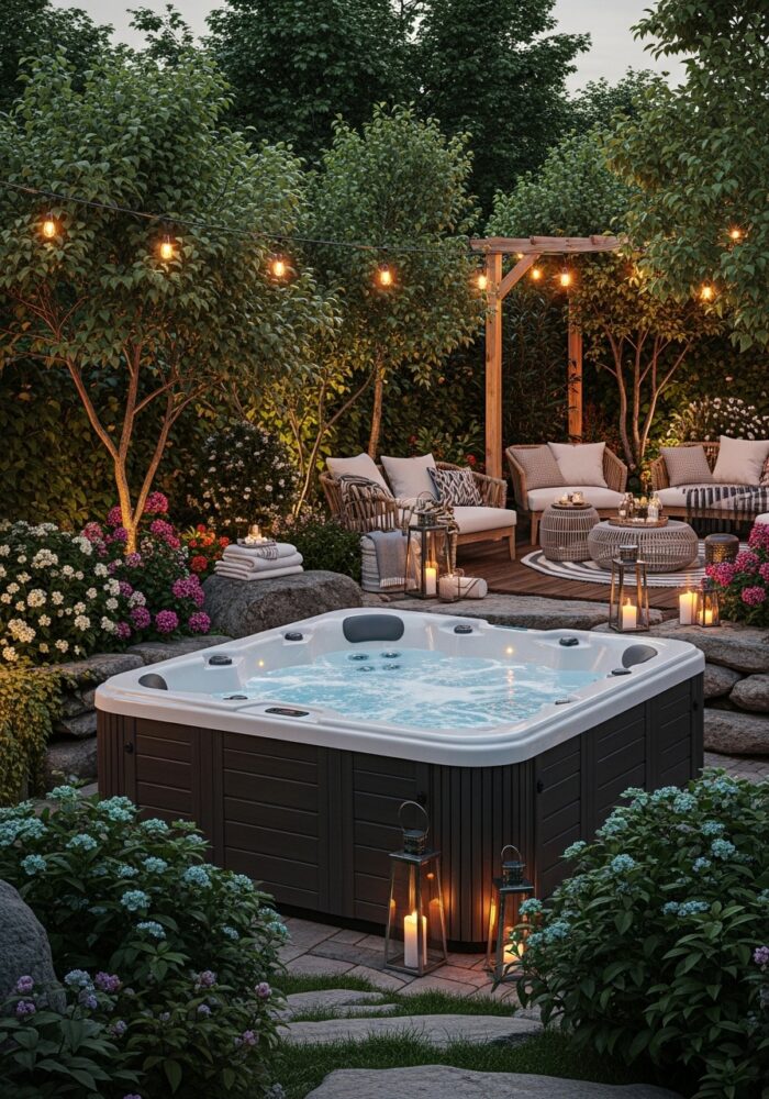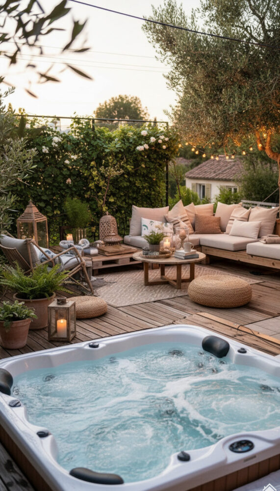 Place weather-resistant lounge chairs or a bench next to the spa. This creates a social zone for entertaining.