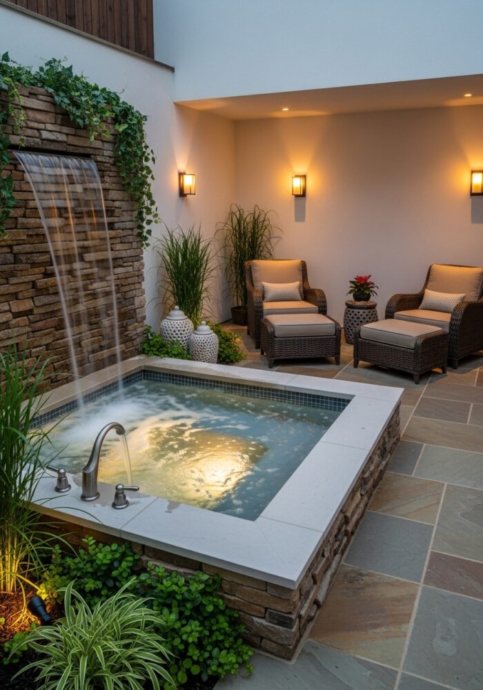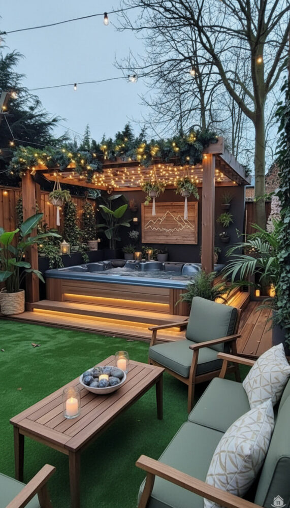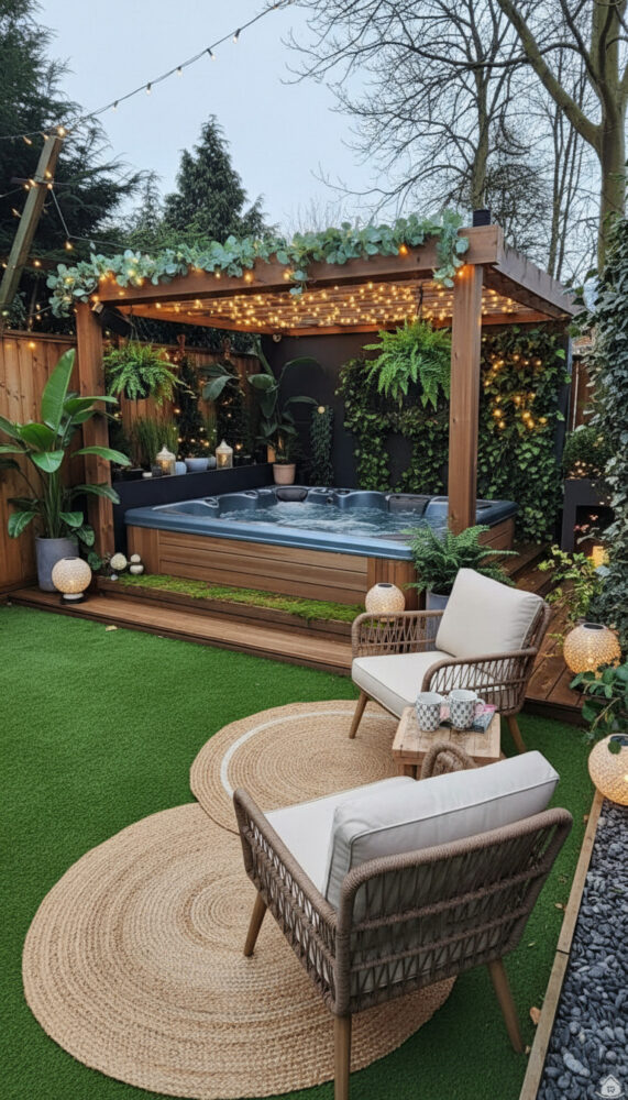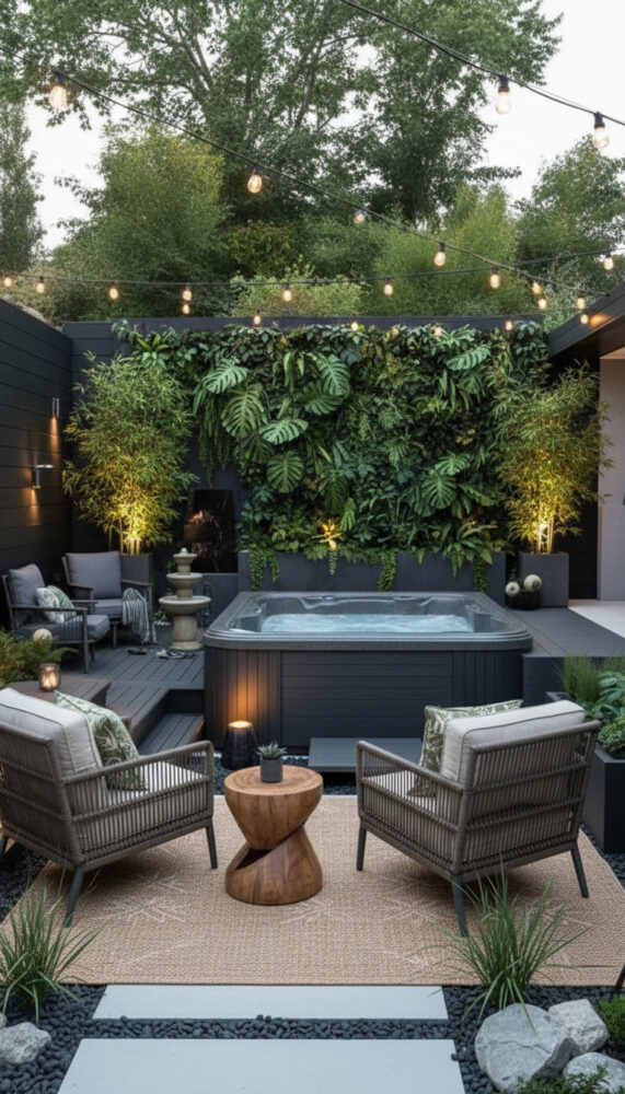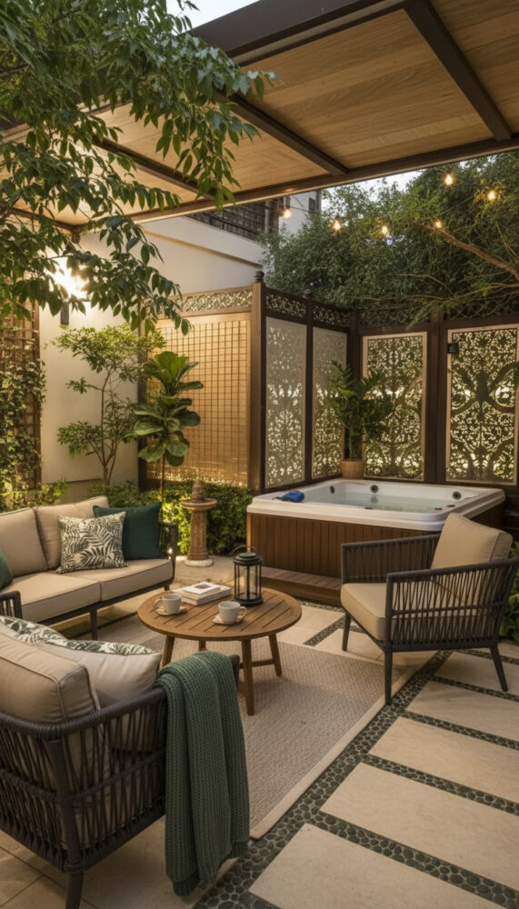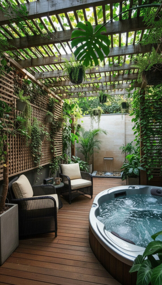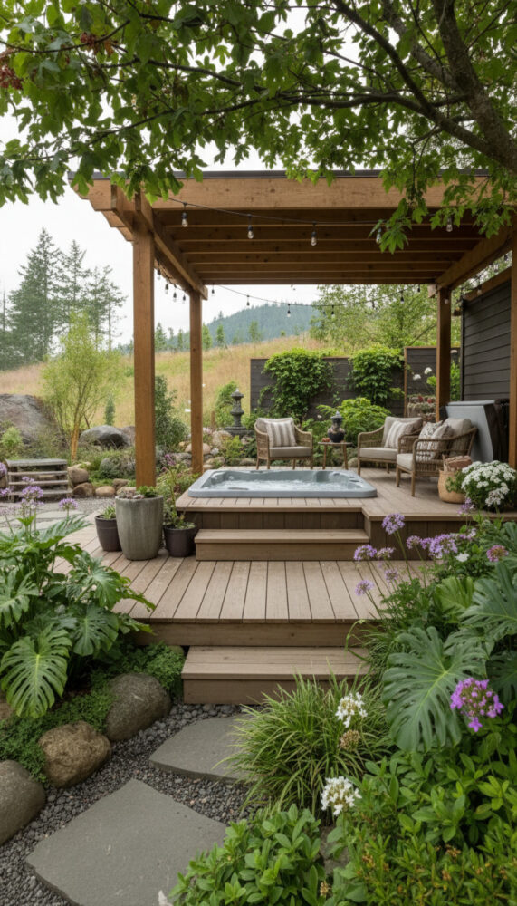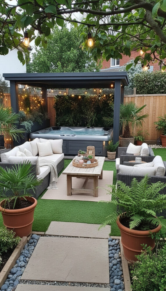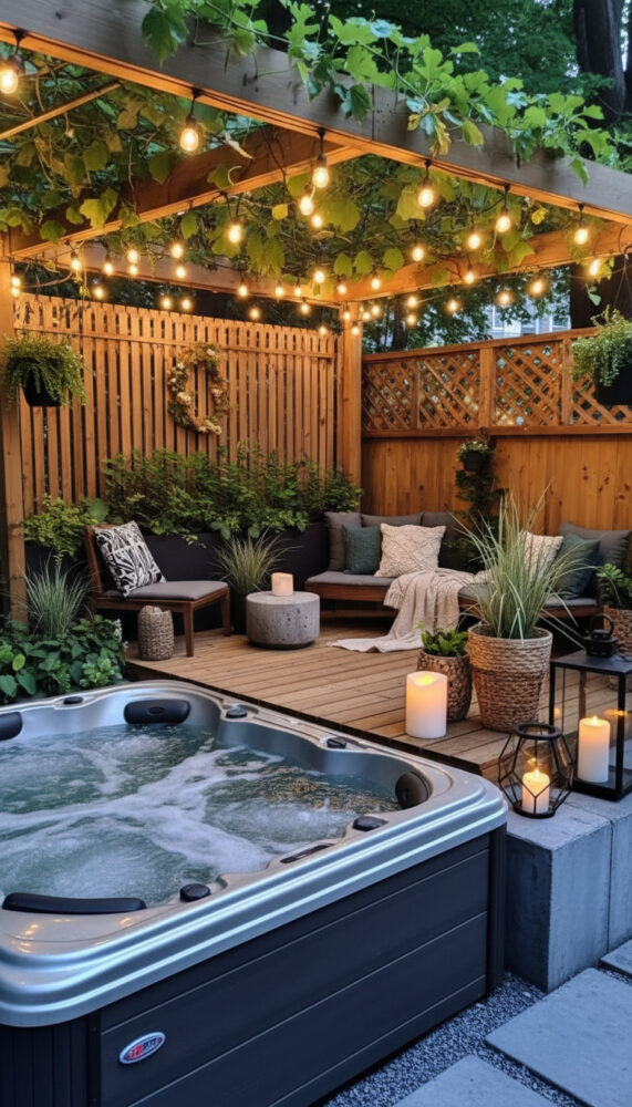 Place weather-resistant lounge chairs or a bench next to the spa. This creates a social zone for entertaining.