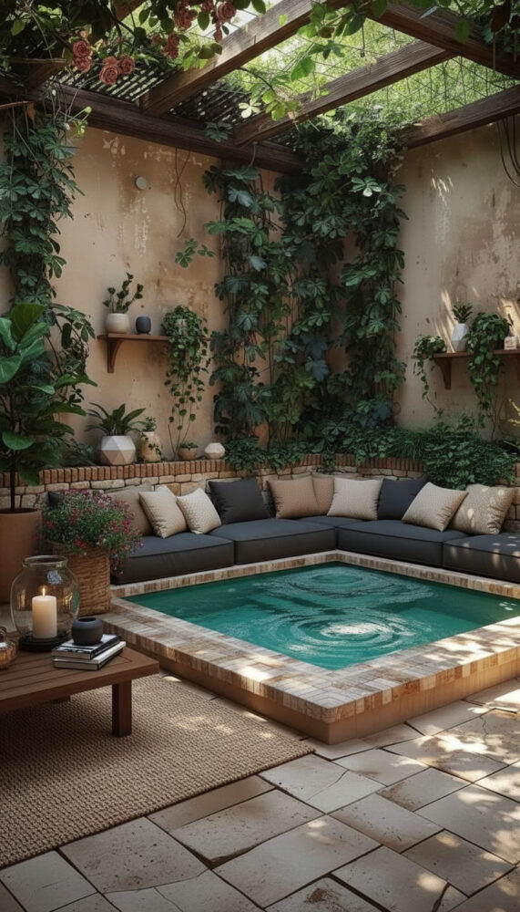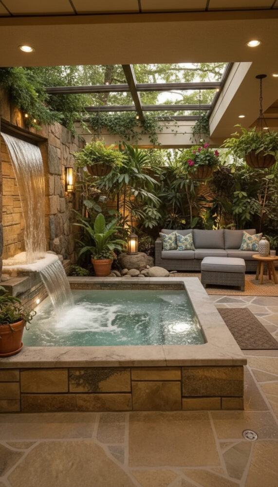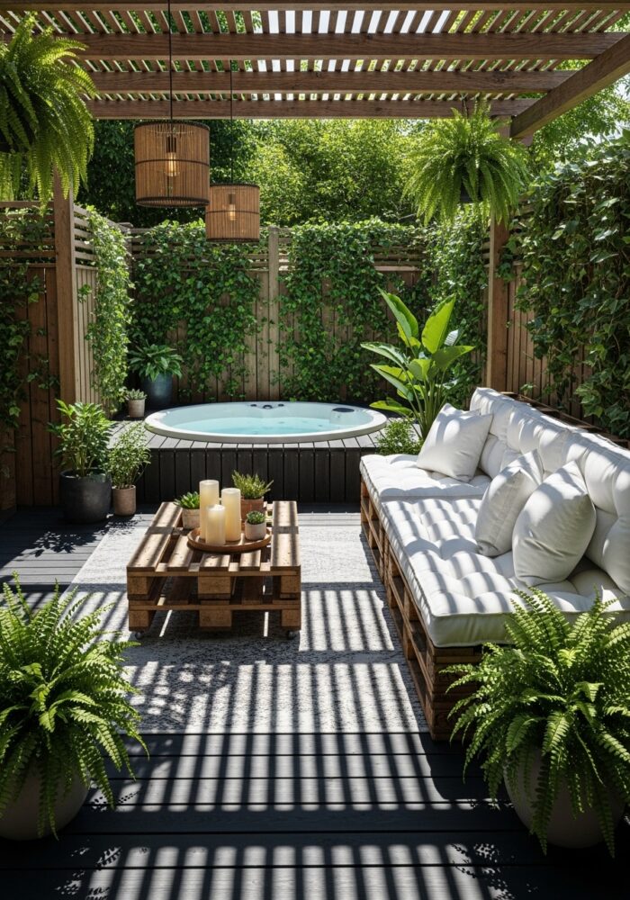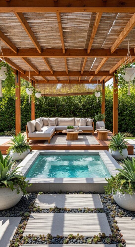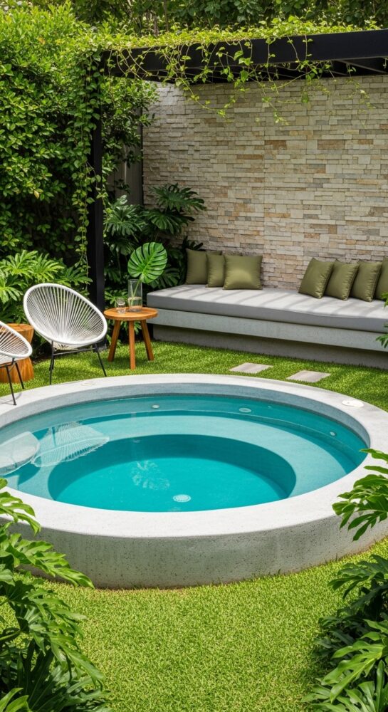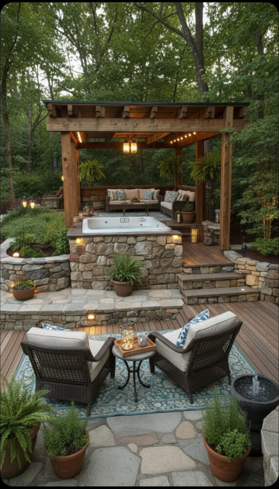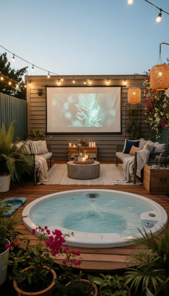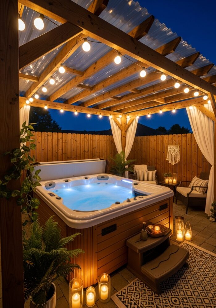 Place weather-resistant lounge chairs or a bench next to the spa. This creates a social zone for entertaining.