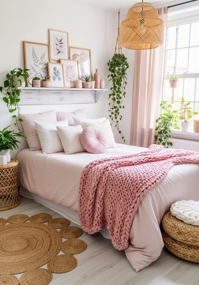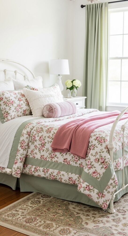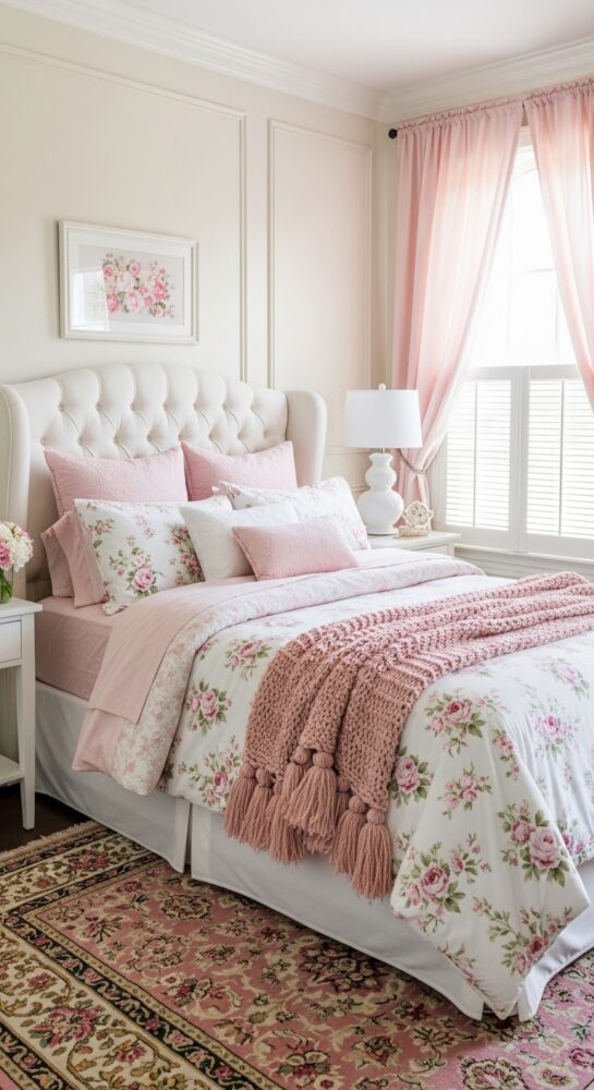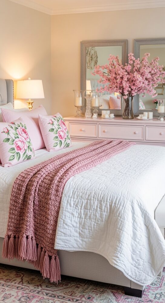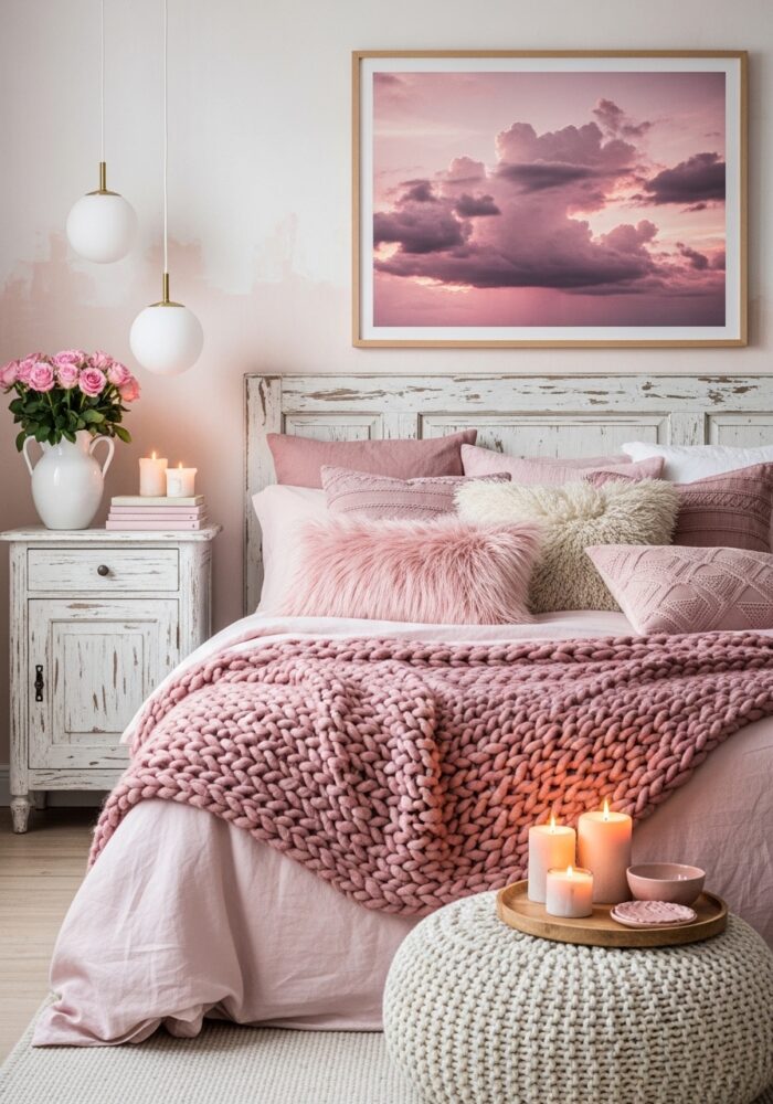 Choose pillows or bedding featuring fabric rosette details. This texture enhances the cozy layered textiles look.