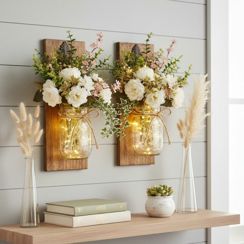 Choose Mason Jar Wall Sconces or distressed metal finishes. Soft lighting enhances the feminine interior design.