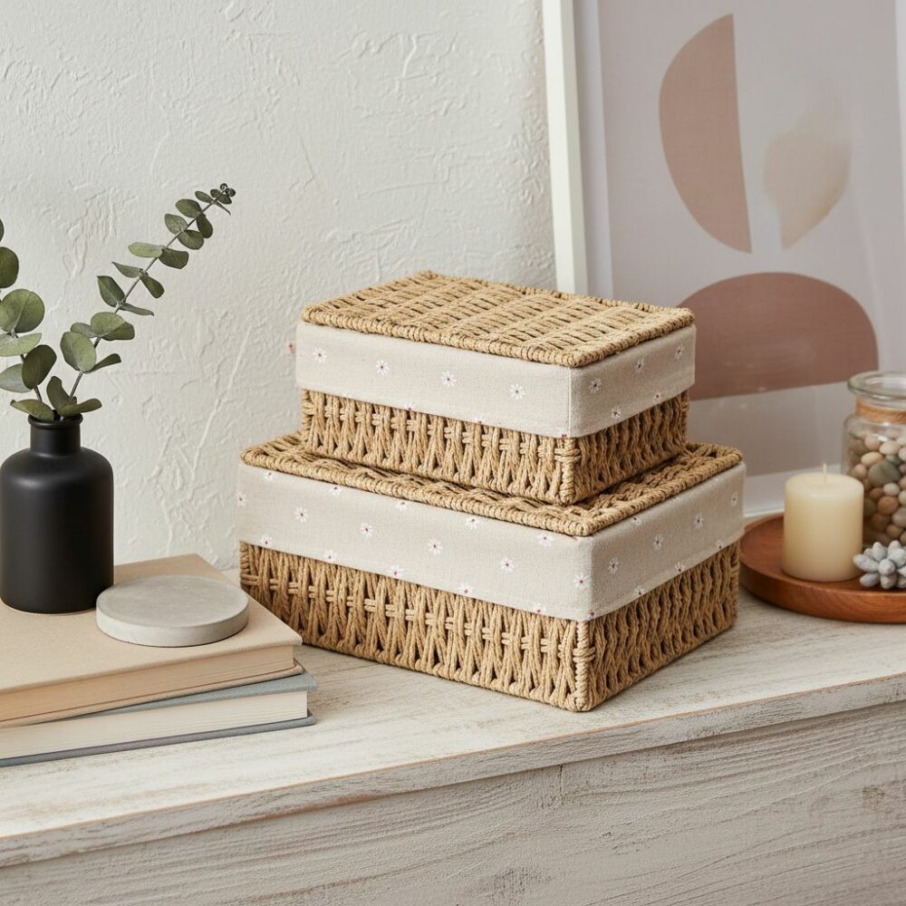 Plastic bins ruin the vintage aesthetic immediately. Natural materials blend seamlessly with wood and fabric.