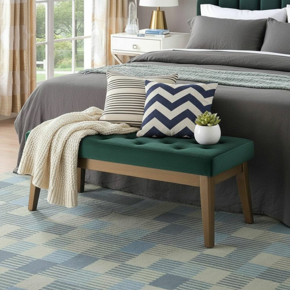 Set up an antique vanity table with a tri-fold mirror and a comfortable Tufted Velvet Bench. Display perfume bottles on a silver tray.