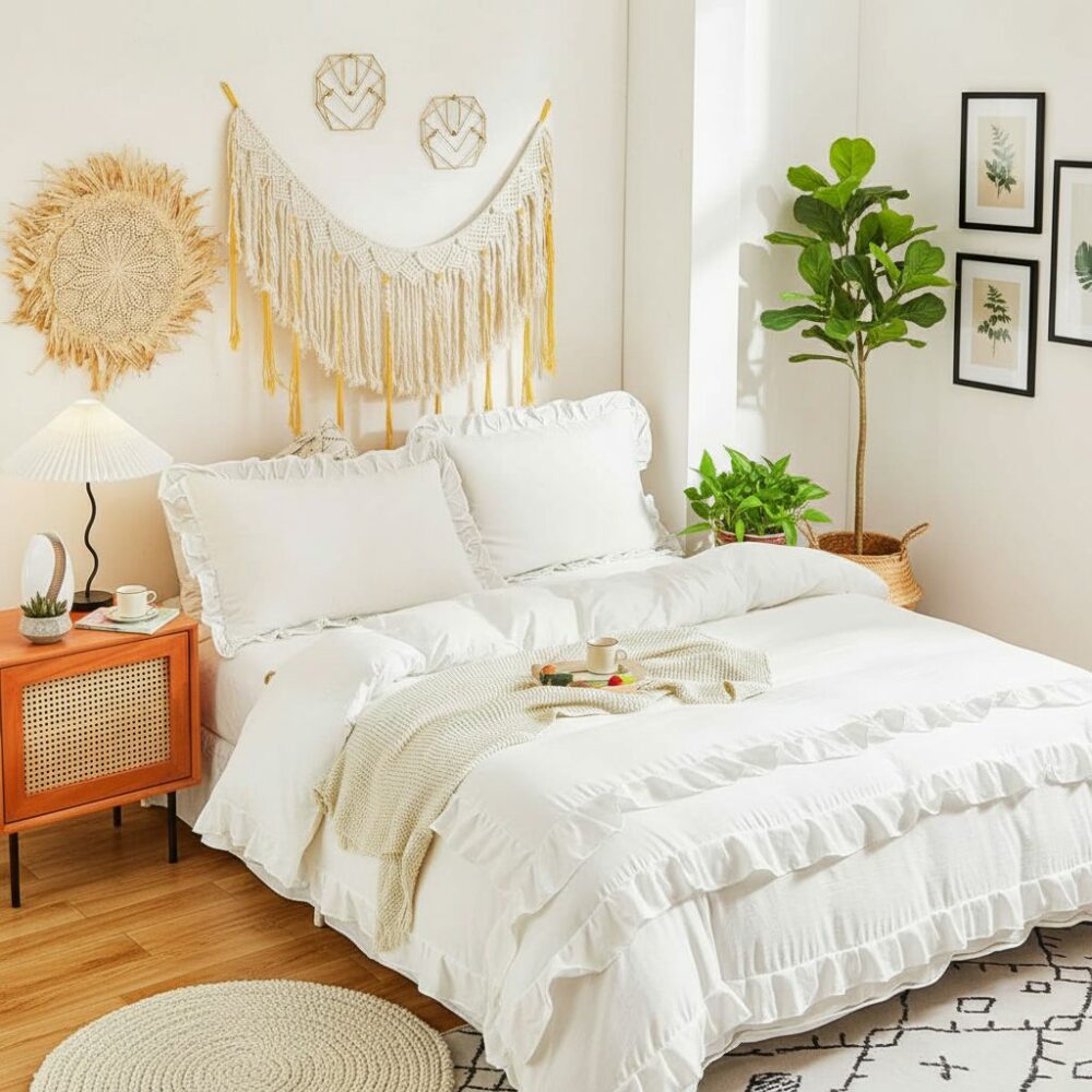 Use a Ruffled Duvet Cover Set (White) or soft linen fabrics. This creates a cloud-like bed that invites deep relaxation.