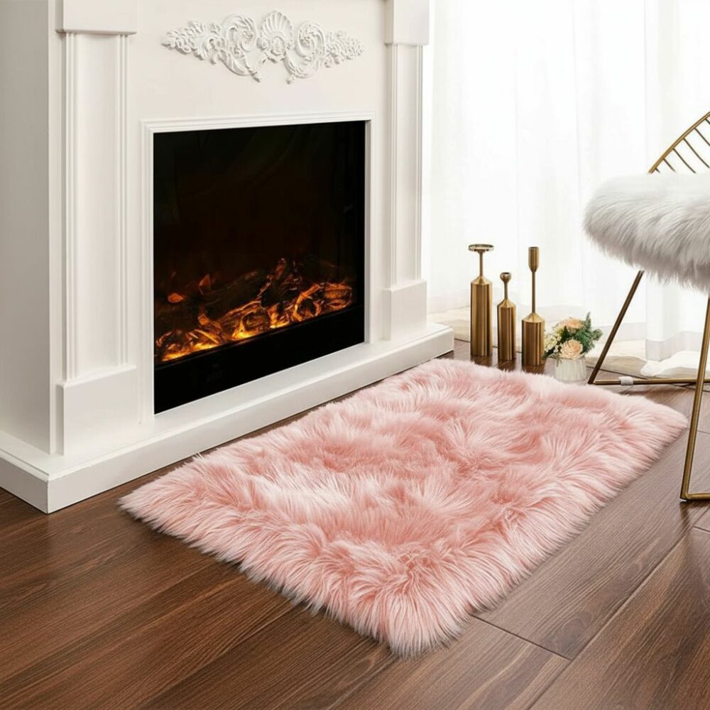 Layer a sheepskin or Faux Fur Rug (Pink) beside the bed. It adds luxury and texture to rustic elegance.