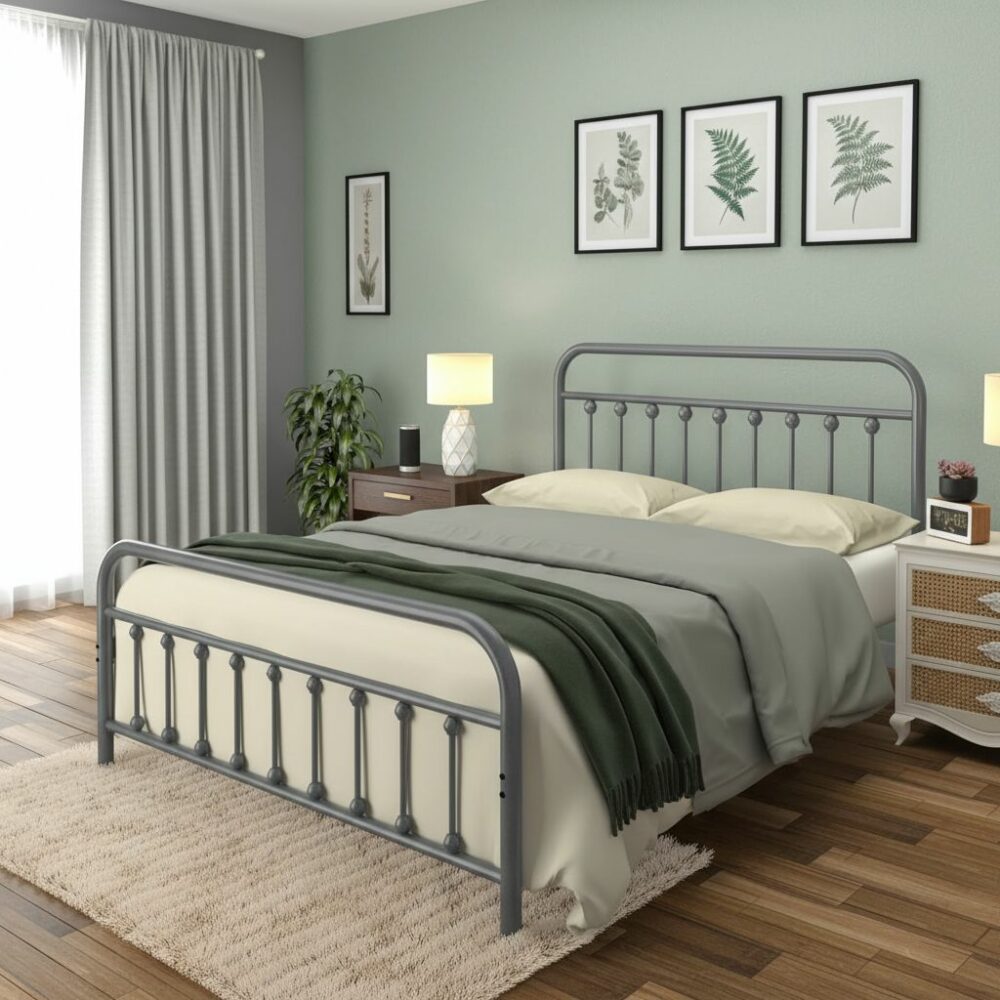 The bed frame creates the silhouette of the room. Modern platform beds lack the vintage curvature needed for this look.